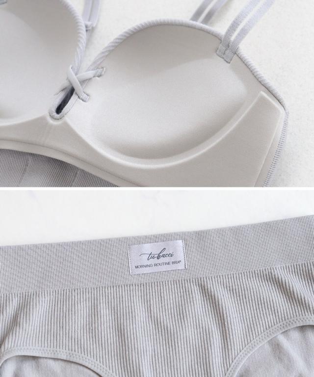 tu-hacci Bra Collection ブラ&ショーツ / 計2点セット 〜モーニングルーティンブラシリーズ〜 素敵な一日の始まりは下着選びから。 どんな朝も思わず手に取りたくなるランジェリー。 細部までこだわり抜いた贅沢デザインに、バストメイク機能を限りなく詰め込んで。 毎日に彩りを与え、気持ちを高めたい女性へ贈るシリーズです。 ノンワイヤーでつくりだす魅惑的な谷間。 シンプルでモダンなデザインはノーブルな佇まい。 ホックレス×リブタイプは、よりヘルシーな印象になるため 見せブラとしてファッションの一部としても◎ 中央のクロスコードは、美しいボディシルエットを加速させます。 お揃いショーツの縦ラインのリブが美しいシルエットを演出し、あなたのスタイルを一段と引き立てる。 ■盛れるノンワイヤー 盛れ感はそのままに、付け心地を追求しリニューアルした厚手の盛りパッドを搭載。 下と横からしっかりバストを持ち上げます。 ノンワイヤーでもホールド感が抜群でしっかり盛れます。 ☆こんなお悩みのある方におすすめです ・ワイヤーの窮屈感や痛いのが苦手 ・バストにボリュームが欲しい ・産後のそげ胸に悩んでいる ・可愛いジムウェアをさがしている ※こちらの商品は2025年2月にリニューアルいたしました。これ以前のレビューはリニューアル前の商品に対するものとなりますので、ご参考の際はご注意ください。 ≫ ギフトラッピングはこちら ≪ | |