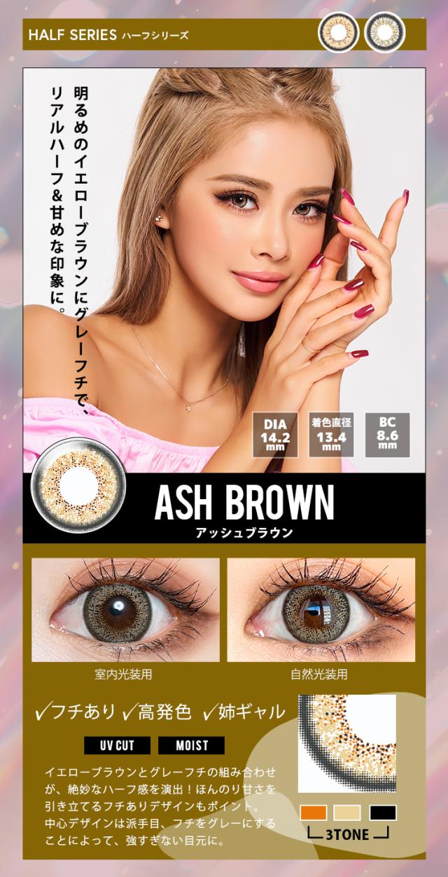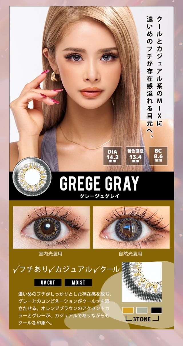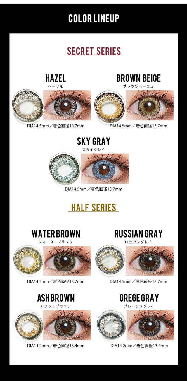 ■ヘーゼル(HAZEL) 【DIA14.5mm / GDIA13.7mm】 大人の色気を漂わせるスモーキーブラウンと 高発色のアッシュベージュが、目元に深みを与える。 絶妙なフチ感が目を引き、華やかで目力を一段と引き立てる。 ■ブラウンベージュ(BROWN BEIGE) 【DIA14.5mm / GDIA13.7mm】 ゴールド系ブラウンの放射模様が派手オーラルを放ち、 圧倒的な存在感で目を引く。 高発色のゴールドと立体感あふれるデザインがゴージャスな印象へ。 ■スカイグレイ(SKY GRAY) 【DIA14.5mm / GDIA13.7mm】 ブルーグレーとフチのコンビネーションが目を引き、盛れ感を演出。 ビー玉のような美しい高発色青みグレーと立体感が目元に魅力を加えて印象的な目元へ。 ■ウォーターブラウン(WATER BROWN) 【DIA14.5mm / GDIA13.7mm】 3トーンデザインが織り成すヌーディな透明感で、 リアルハーフ瞳を実現。 馴染みあうように配置されたドットが、 高発色ながらも派手になり過ぎない抜け感のある瞳に。 ■ロシアングレイ(RUSSIAN GRAY) 【DIA14.2mm / GDIA13.0mm】 グレーから広がるゴールドブラウンが透け感溢れる クールで洗練されたハーフな目元へ。 瞳に馴染みやすいグレーは大人のメイクにも合うおしゃれEYEに。 ■アッシュブラウン(ASH BROWN) 【DIA14.5mm / GDIA13.5mm】 ダークブラウンにぼかしを入れた上品な 大人盛れレンズで瞳を大きくやわらかい印象に。 ■グレージュグレイ(GREGE GRAY) 【DIA14.2mm / GDIA13.4mm】 濃いめのフチがしっかりとした存在感を放ち、 グレーとのコンビネーションがクールさを惹き立たせる。 オレンジブラウンのアクセントカラーとグレーが カジュアルでありながらもクールな印象へ。 |