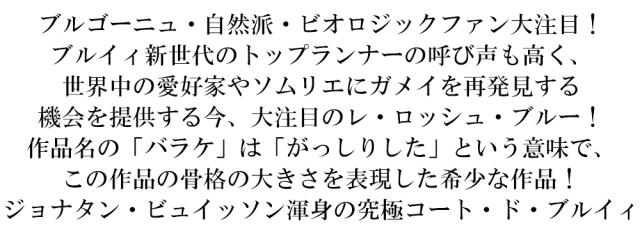 ブルゴーニュ・自然派・ビオロジックファン大注目! ブルイィ新世代のトップランナーの呼び声も高く、 世界中の愛好家やソムリエにガメイを再発見する 機会を提供する今、大注目のレ・ロッシュ・ブルー! 作品名の「バラケ」は「がっしりした」という意味で、 この作品の骨格の大きさを表現した希少な作品! ジョナタン・ビュイッソン渾身の究極コート・ド・ブルイィ