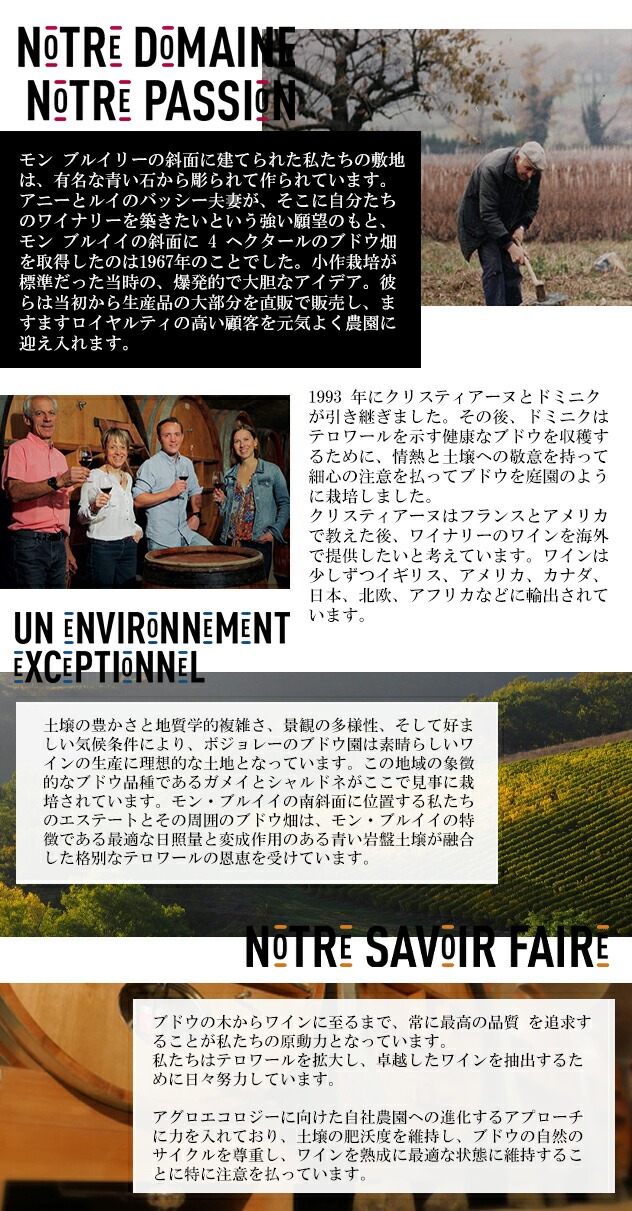 ■発酵・熟成:除梗しない(全房発酵)!コンクリート製タンクで発酵後、48hlのフードルで8〜10ヶ月間熟成!■土壌:バラ色花崗岩質土壌 ■収量:45hl/ha ■平均樹齢:50年 希少!入手困難!ブルゴーニュ辛口赤ワイン愛好家大注目!ブルゴーニュ・自然派・ビオロジック(「アルプ・コントロール」の認証)辛口赤ワイン愛好家大注目! ワイン誌「「La Revue du Vin de France」、「Beaujolais Aujourd’hui」、「Les 5 du Vin」、「Bourgogne Life」、「Magasine La Vigne」、「Le Progres」、「Trends」、「Le Patriote」、「France 3」等多数」大注目! SO2はビン詰め時にのみ極少量使用!作品名の「バラケ」は「がっしりした」という意味で、この作品の骨格の大きさを表現したものです! もちろん現地のセラー数ヶ月前の蔵出し作品で正規品の素晴らしい状態で限定少量入荷! |