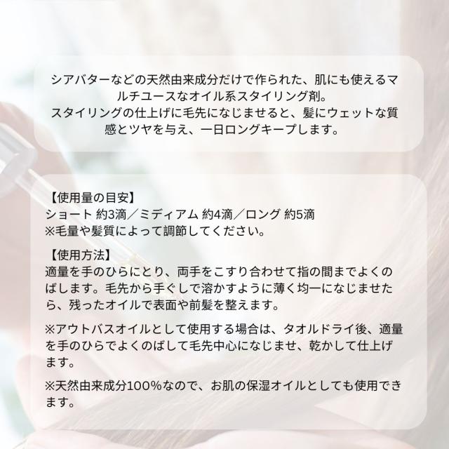 天然由来原料のみでできた全身に使えるマルチユースオイル。スタイリングの仕上げに毛先になじませると、髪にウェットな質感とツヤを与え、一日ロングキープします。髪の広がりやパサつきが気になる方にもおすすめです。
