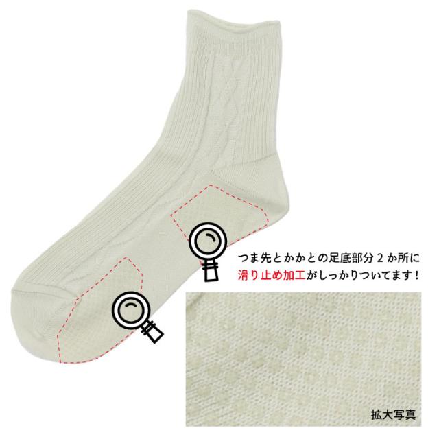 | 特長 | 滑り止め付きクルー丈ソックス。 靴の中やフローリングでもすべりにくい仕様です。綿混素材でオールシーズン対応しています! |