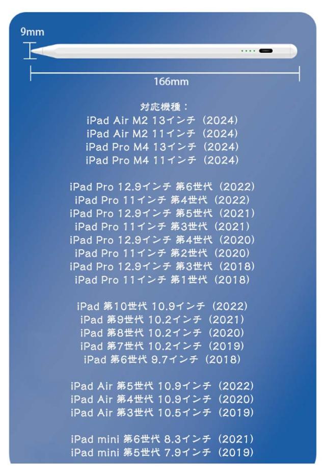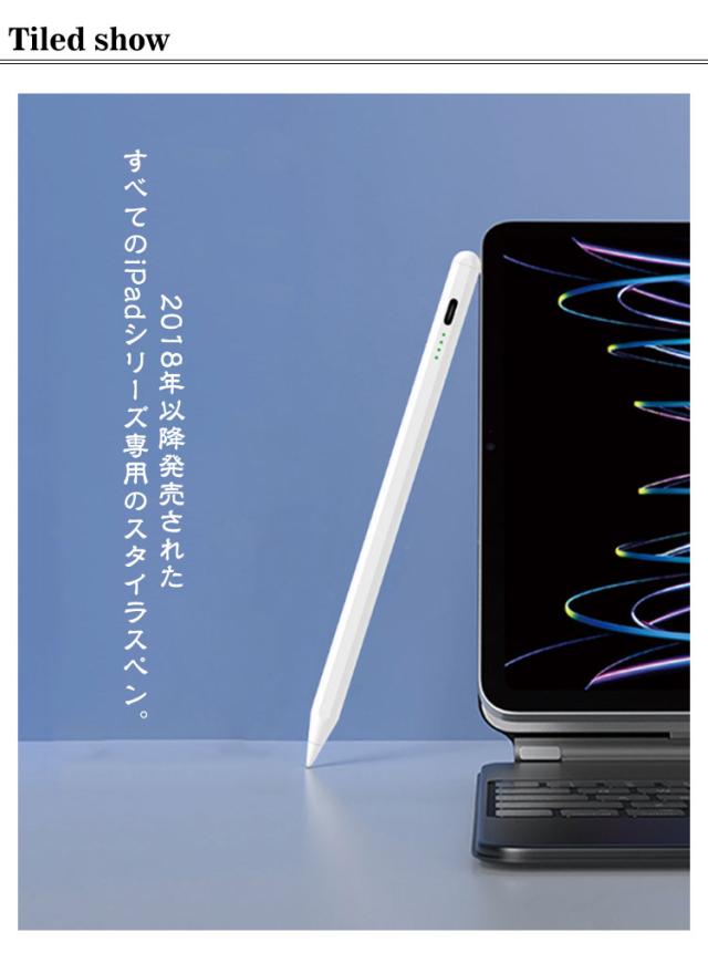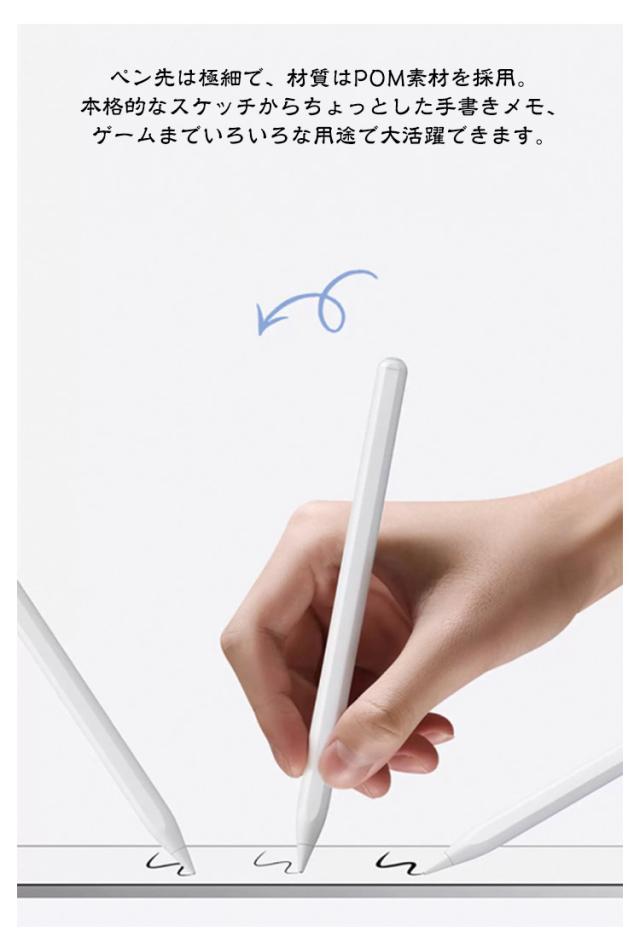 | 【iPad専用タッチペン】【残量表示】【誤操作防止】【高感度】 2018年以降発売されたすべてのiPadシリーズ専用のスタイラスペン。 誤操作防止。手が画面に触れても誤動作しないパームリジェクション機能を搭載。タッチペンを使用する時は手を自由に画面上に置くことができます。 高性能センサーを採用で正確なタップと滑らかな操作を実現。線の途切れはもちろん、遅延・位置ズレもなく、ペン先感知機能が非常に繊細。 ペン先は極細で、材質はPOM素材を採用。本格的なスケッチからちょっとした手書きメモ、ゲームまでいろいろな用途で大活躍できます。 スタイラスペン本体にマグネットを内蔵。お好きなところにホールドできます。 手のひらに馴染みやすいように設計されています。高級感があり指紋が付きにくい。一体成型のスタイリッシュなデザインで高級感を演出します。 絵描き/イラスト/ゲーム/仕事/ビジネス/学業/学習/勉強/絵画/タッチパネルなど、様々な用途に大活躍! Type-C急速充電:充電時間約15min 対応機種: iPad Air M2 13インチ(2024) iPad Air M2 11インチ(2024) iPad Pro M4 13インチ(2024) iPad Pro M4 11インチ(2024) iPad Pro 12.9インチ 第6世代(2022) iPad Pro 11インチ 第4世代(2022) iPad Pro 12.9インチ 第5世代(2021) iPad Pro 11インチ 第3世代(2021) iPad Pro 12.9インチ 第4世代(2020) iPad Pro 11インチ 第2世代(2020) iPad Pro 12.9インチ 第3世代(2018) iPad Pro 11インチ 第1世代(2018) iPad 第10世代 10.9インチ(2022) iPad 第9世代 10.2インチ(2021) iPad 第8世代 10.2インチ(2020) iPad 第7世代 10.2インチ(2019) iPad 第6世代 9.7インチ(2018) iPad Air 第5世代 10.9インチ(2022) iPad Air 第4世代 10.9インチ(2020) iPad Air 第3世代 10.5インチ(2019) iPad mini 第6世代 8.3イン | |