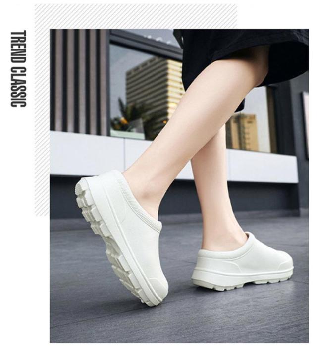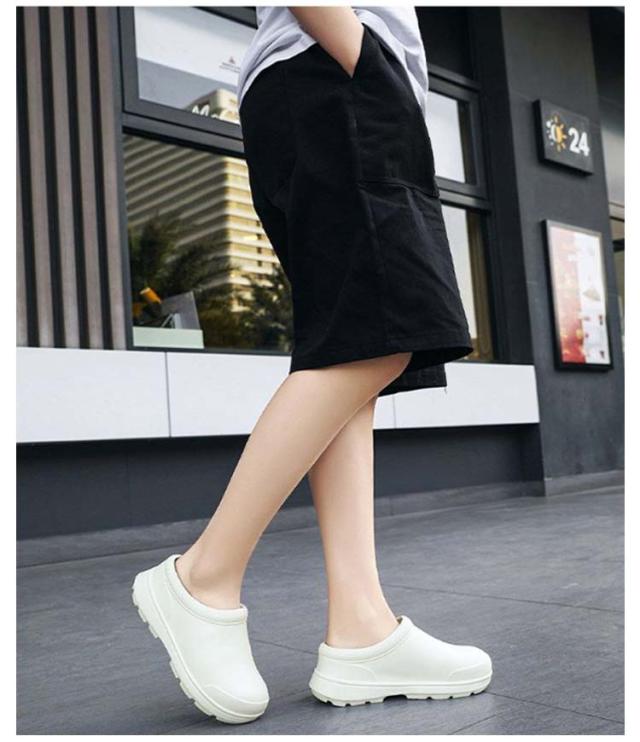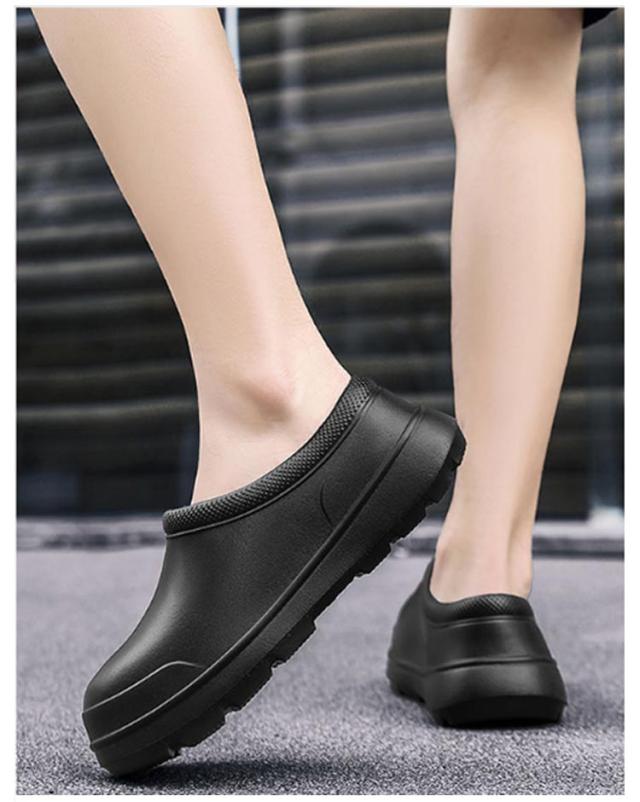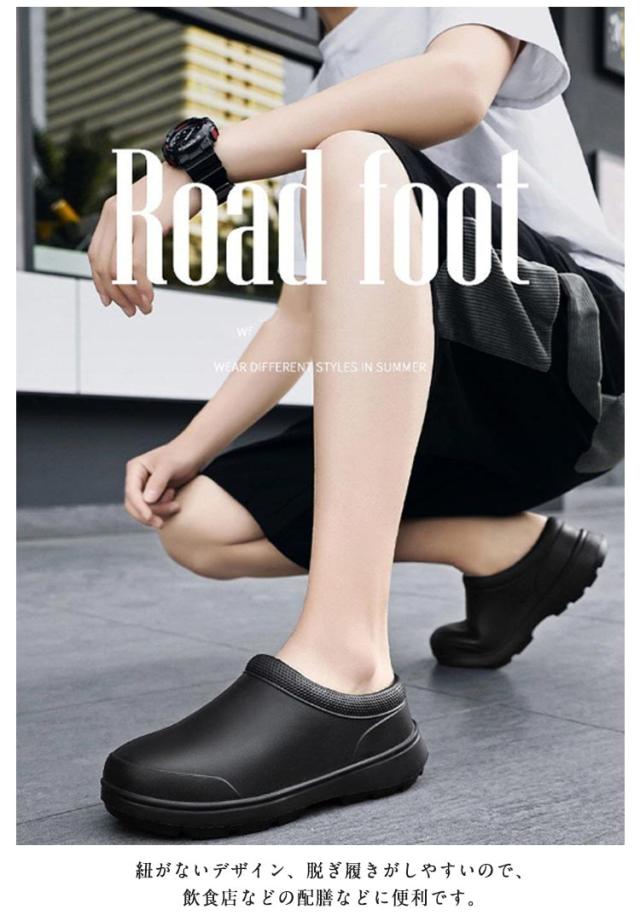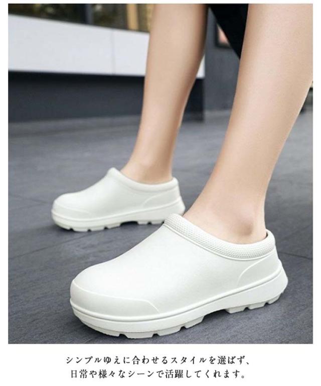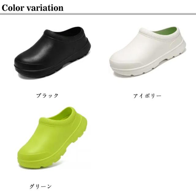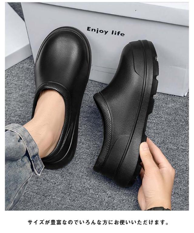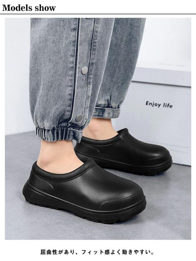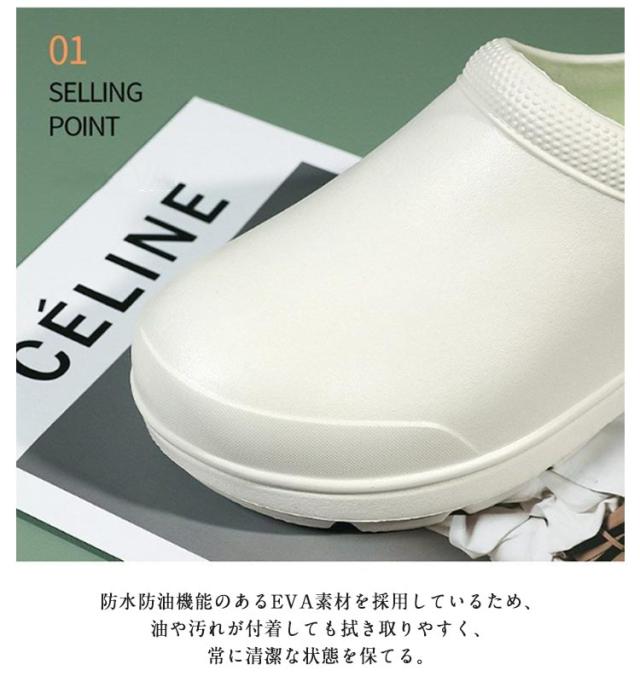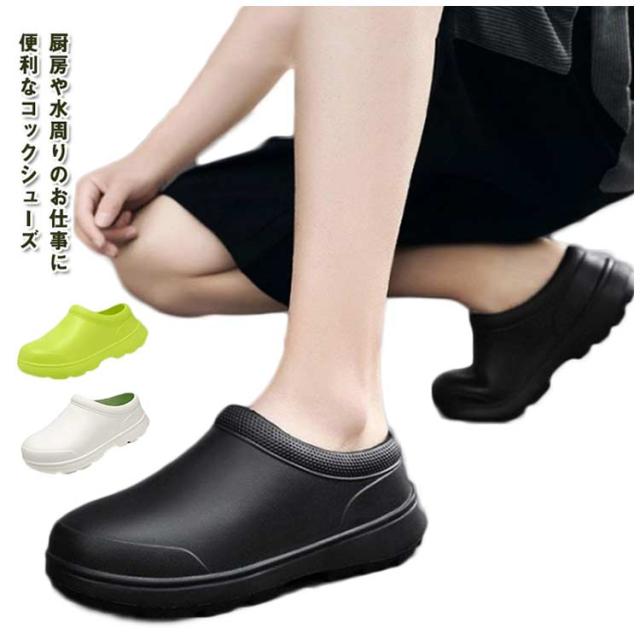 | 厨房や水周りのお仕事に便利なコックシューズ 紐がないデザイン、脱ぎ履きがしやすいので、飲食店などの配膳などに便利です。 防水防油機能のあるEVA素材を採用しているため、油や汚れが付着しても拭き取りやすく、常に清潔な状態を保てる。 屈曲性があり、フィット感よく動きやすい。 厚みのある素材で足を保護、つま先ガードでさらに安心感をプラス! 耐摩耗性があるので靴底が減りにくく、スニーカーのような履き心地です。 サイズが豊富なのでいろんな方にお使いいただけます。 シンプルゆえに合わせるスタイルを選ばず、日常や様々なシーンで活躍してくれます。 | |