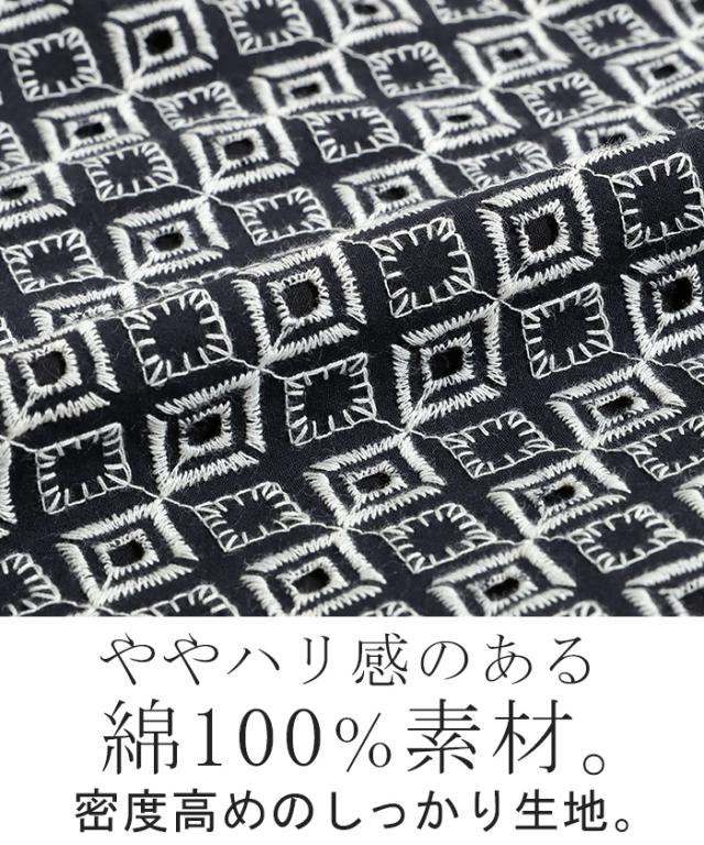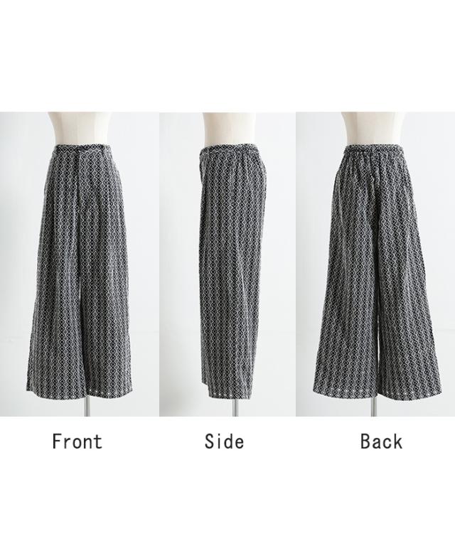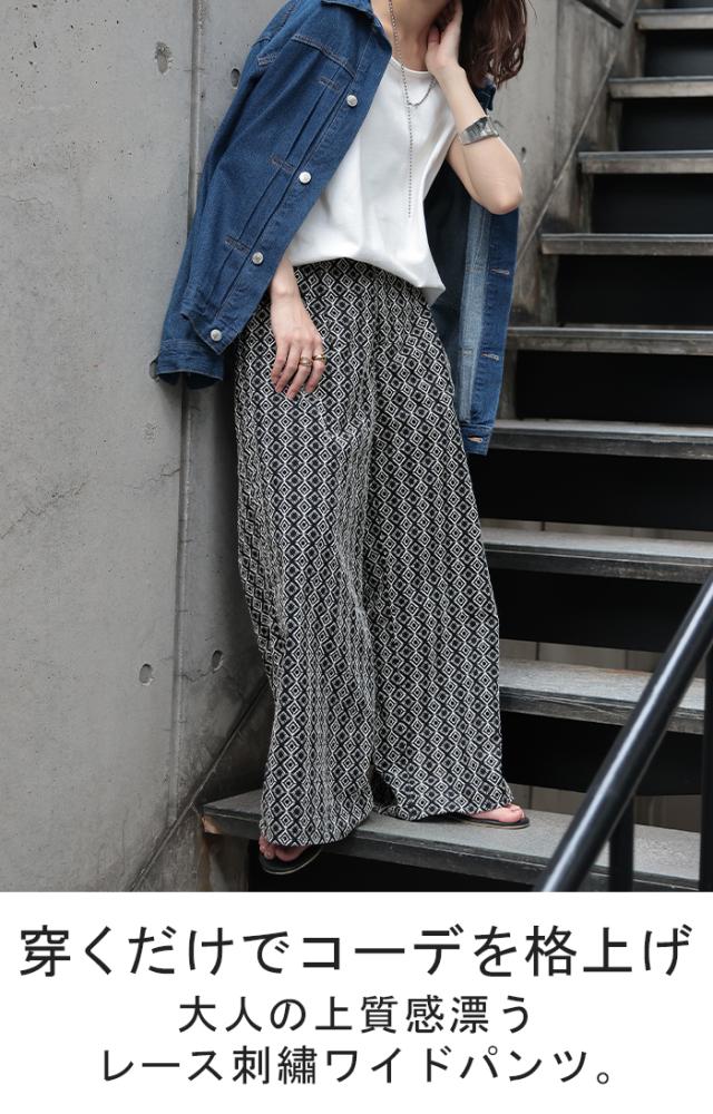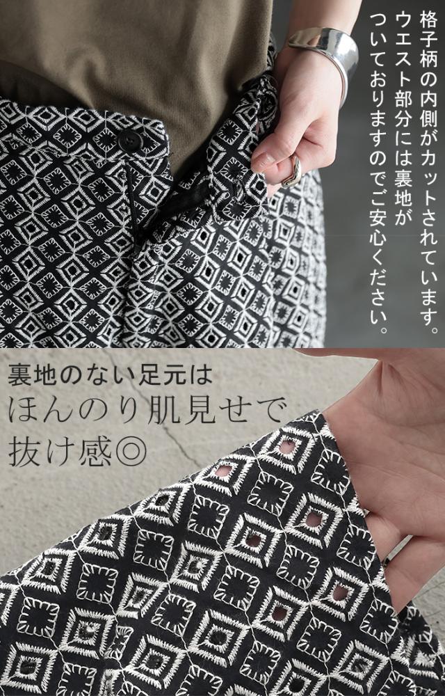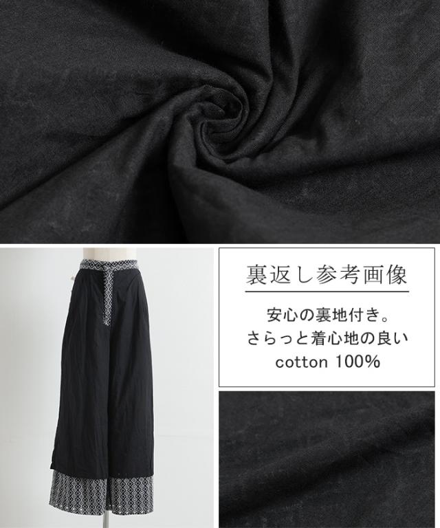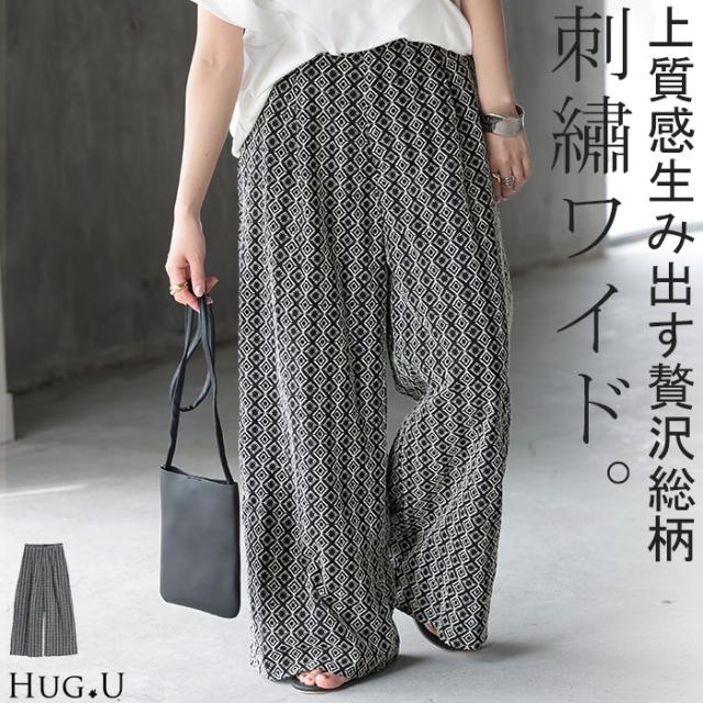 パンツ 刺繍 ワイド 綿100% レディース ロング ワイドパンツ 太い ガウチョ ガウチョパンツ ズボン ハイウエスト カットワークレース 裏地 ウエストゴム タックパンツ コットン100% 総柄 レース ボトムス 体型カバー 大きいサイズ 黒 春 夏 HUG.U 秋新作