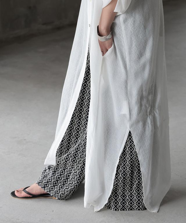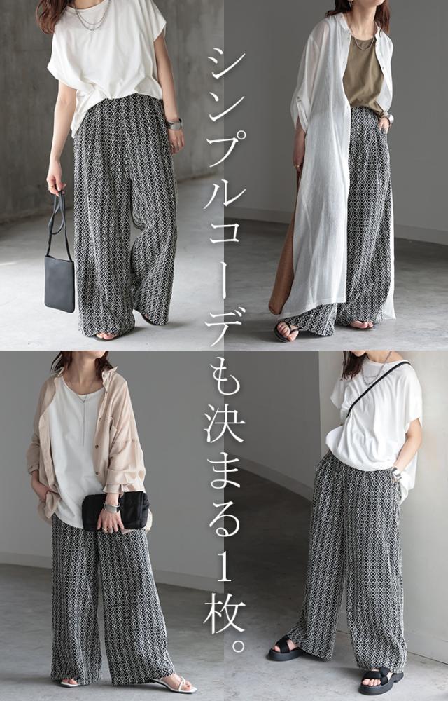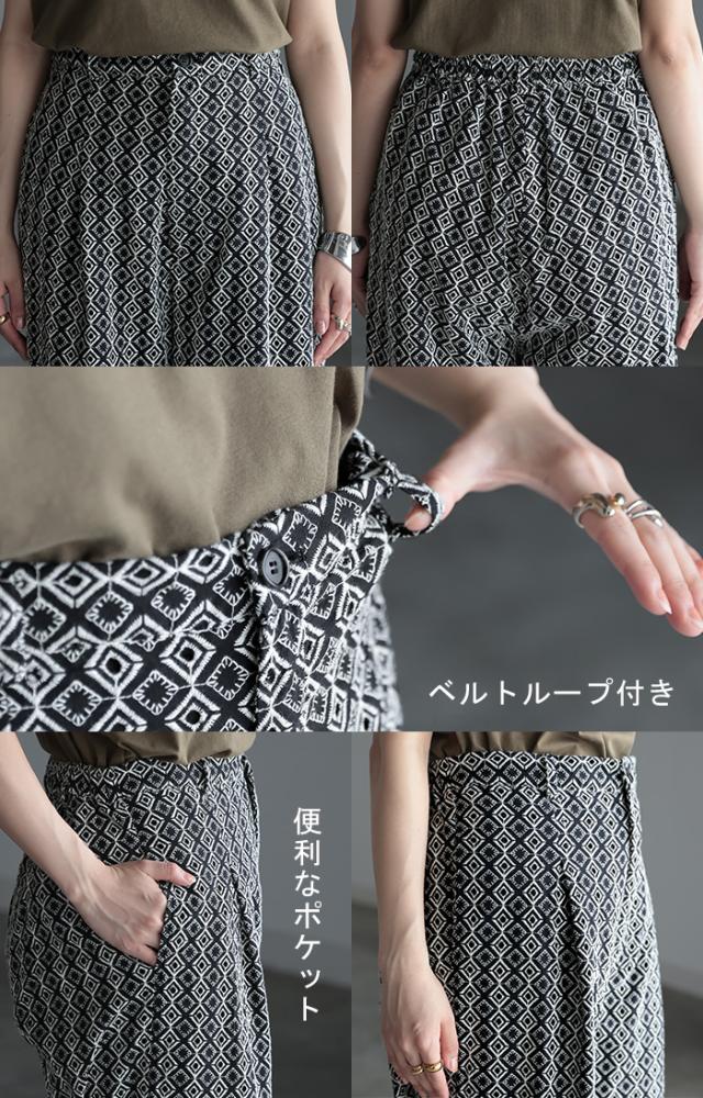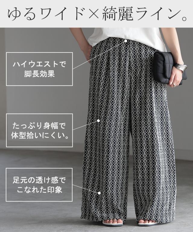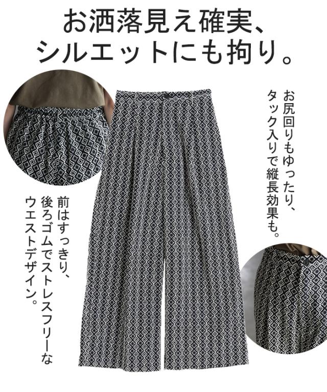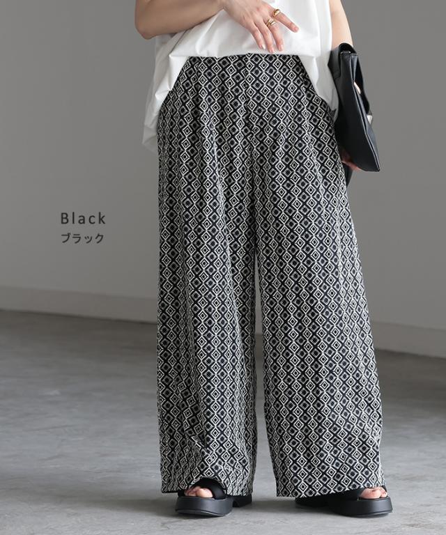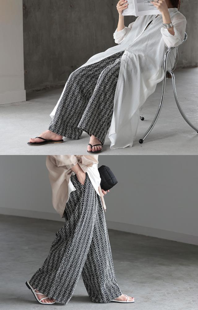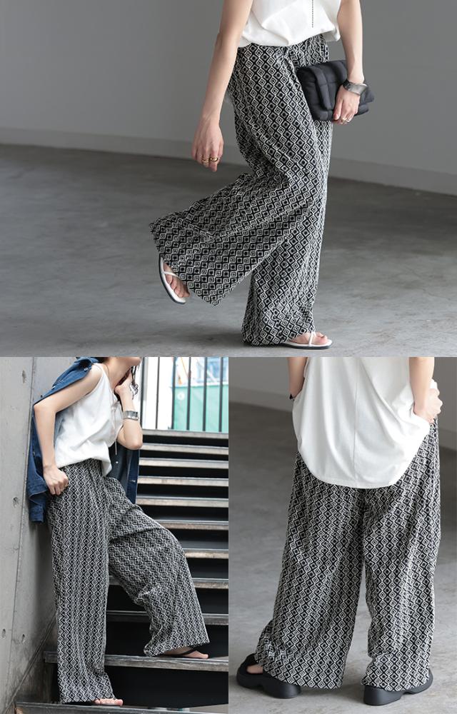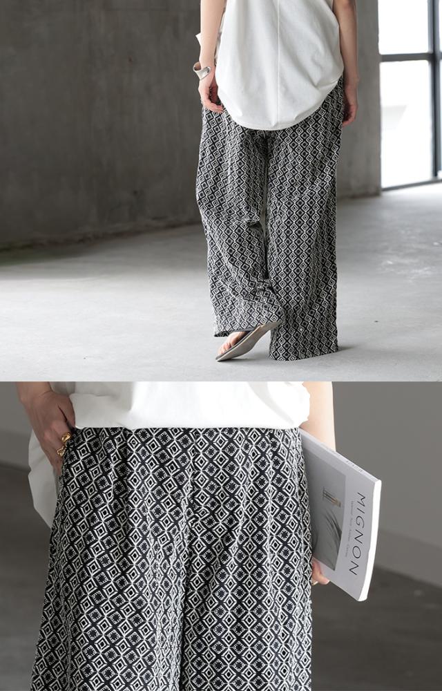 レトロな風合いの幾何学柄が目を惹くワイドパンツです。