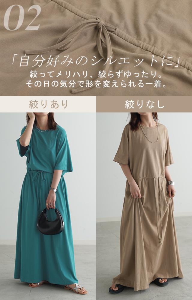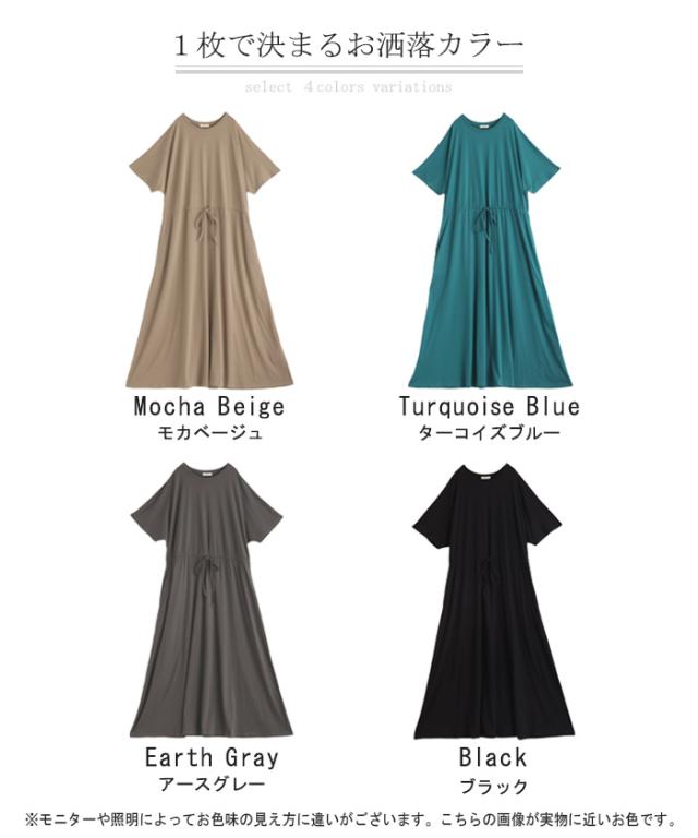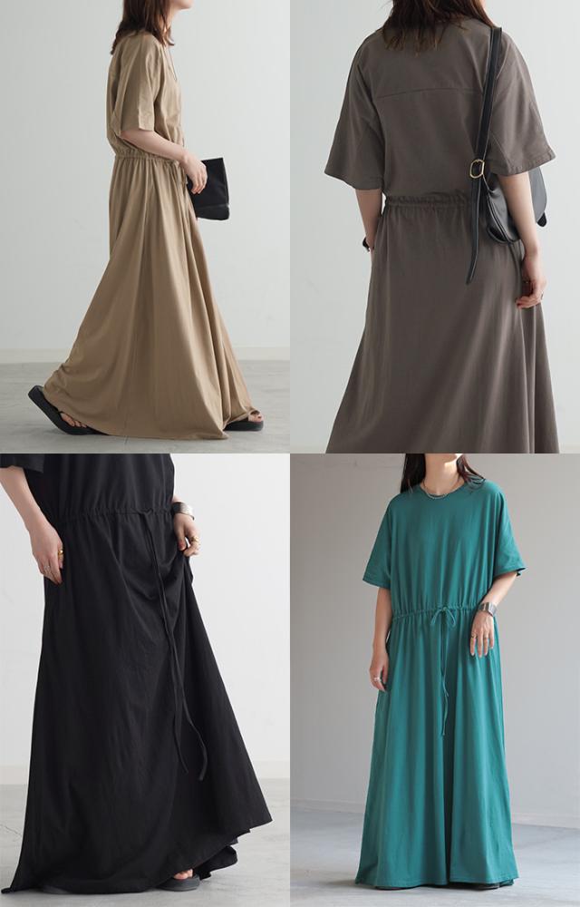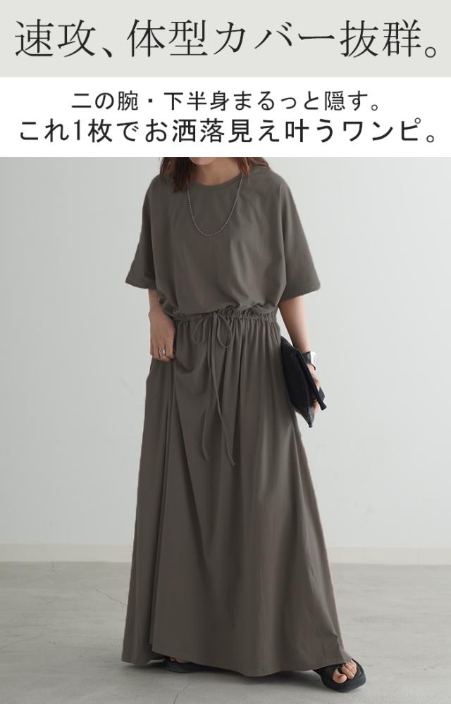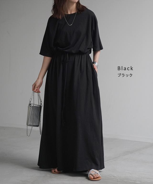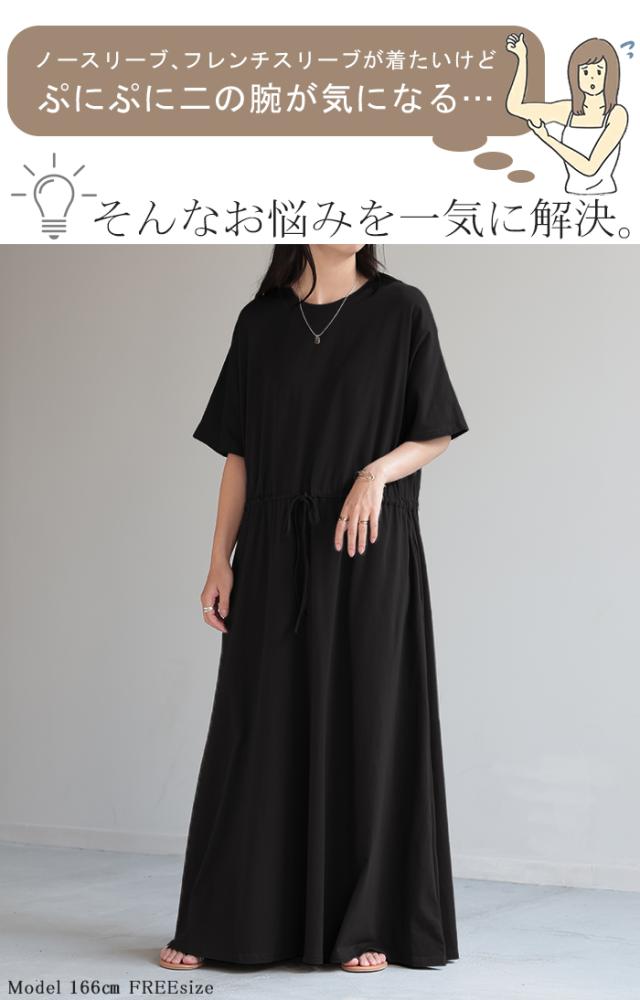 ワンピース ドルマン ロング レディースファッション 一部4月下旬入荷 Tシャツ 半袖 綿 混 Aライン ワンピ 二の腕カバー ロングワンピース マキシワンピース ロングワンピ Uネック ウエストマーク 体型カバー ゆったり きれいめ 大きいサイズ 黒 ブルー 春 夏 HUG.U 秋新作