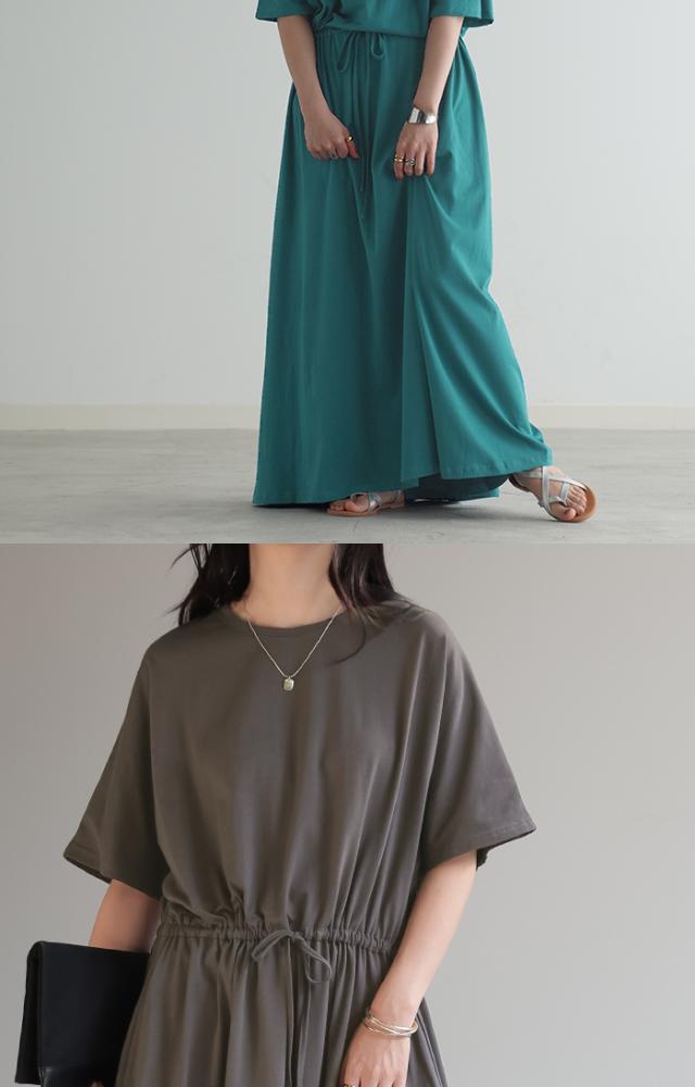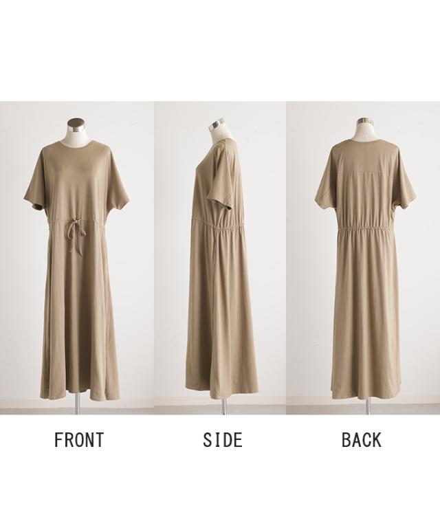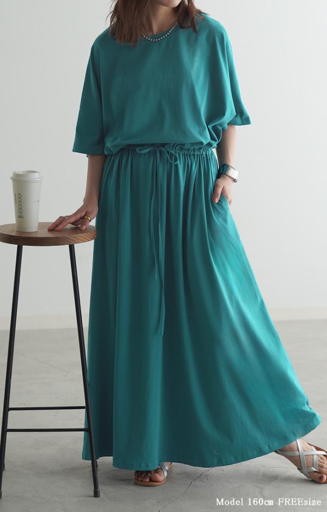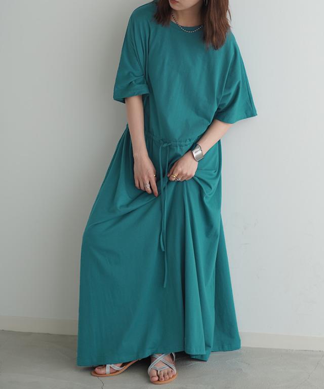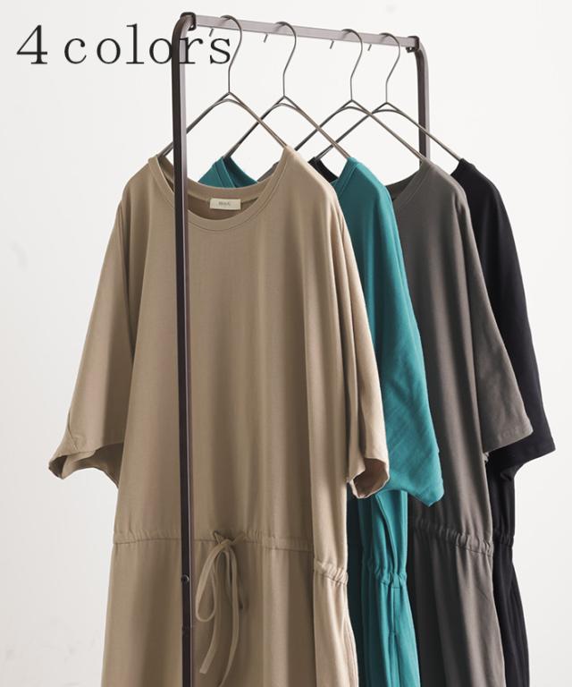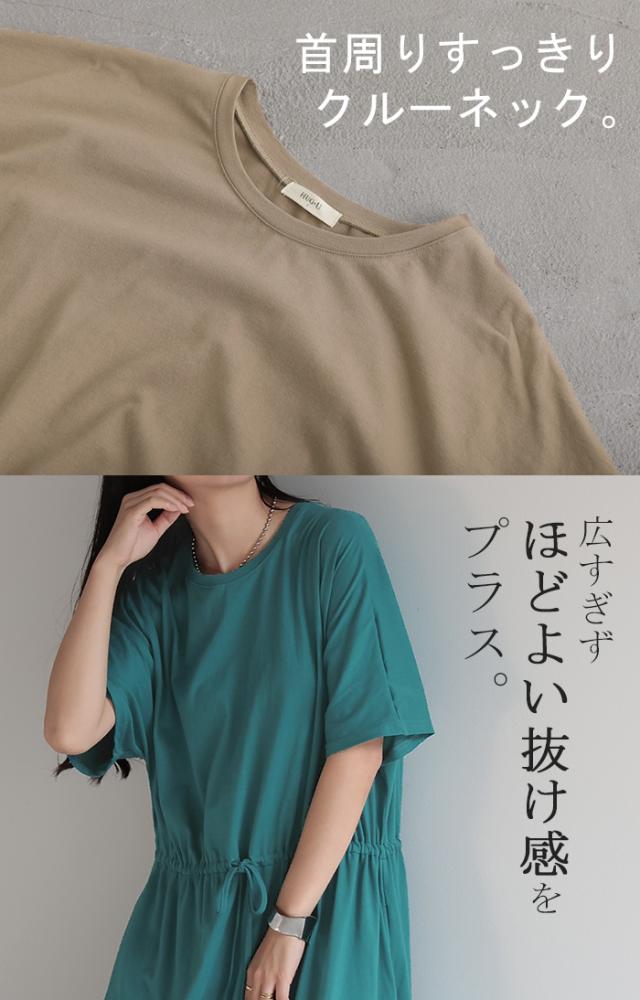 ワンピース ドルマン ロング レディースファッション 一部4月下旬入荷 Tシャツ 半袖 綿 混 Aライン ワンピ 二の腕カバー ロングワンピース マキシワンピース ロングワンピ Uネック ウエストマーク 体型カバー ゆったり きれいめ 大きいサイズ 黒 ブルー 春 夏 HUG.U 秋新作