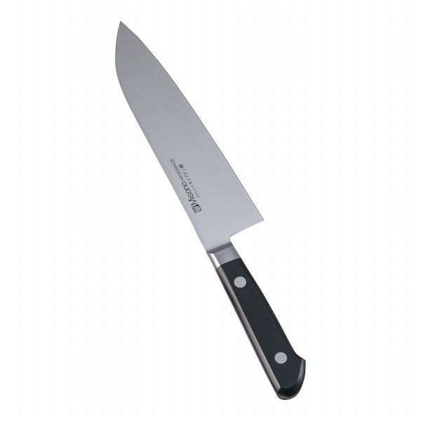 モリブデンとバナジウムの入ったハイカーボンの高級ステンレス・モリブデン鋼を使用し、ハイレベルの技術を駆使した理想の洋包丁です。刀身と一体のツバが衛生的。切れの冴えと耐久性を両立させた最高のできばえが、またひとつ秀作を生みました。