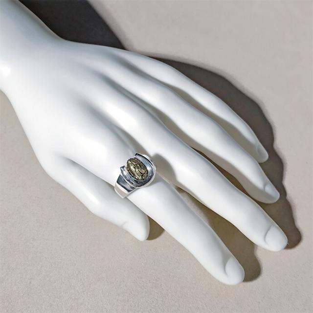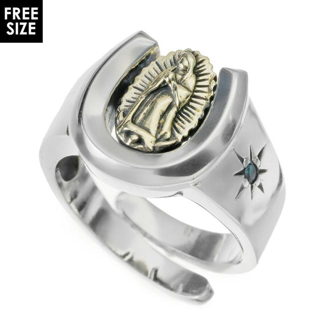 ホースシュー(馬蹄)の中心にマリアメダイがセットされたリングです。メダイはメキシコで最も敬愛されている宗教的シンボル・グアダルーペの聖母がモチーフ。サイドにはロンドンブルートパーズが埋め込まれています。内側がくり抜かれているので、見た目以上に軽い着け心地のアイテムです。