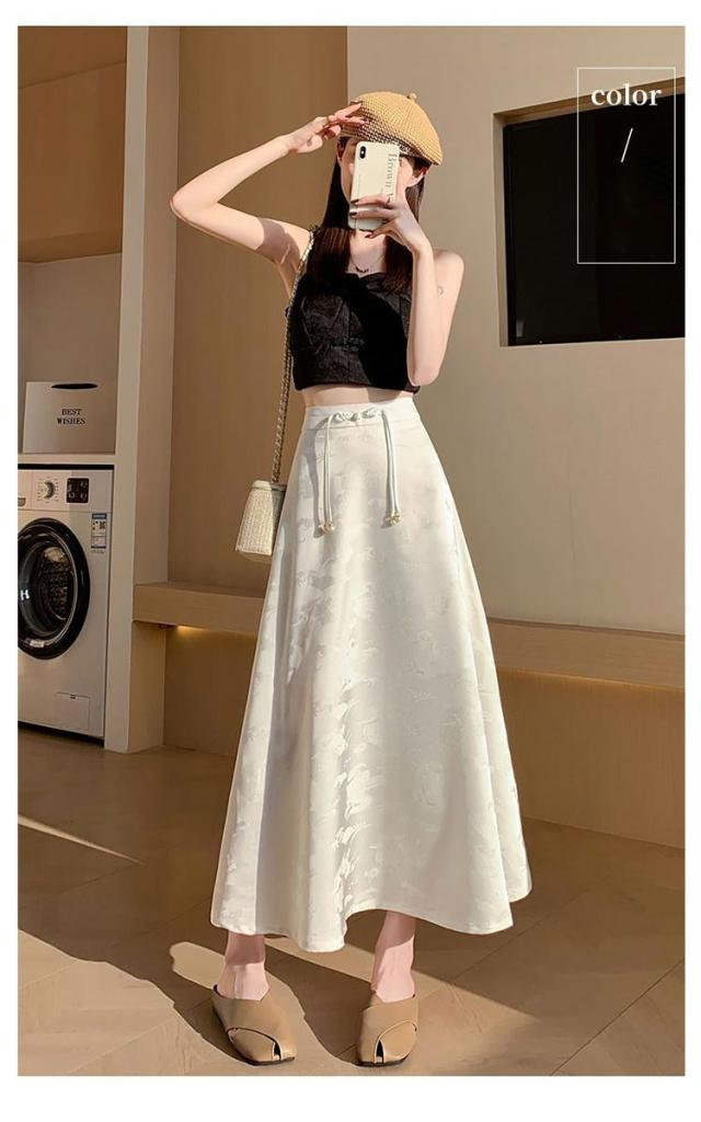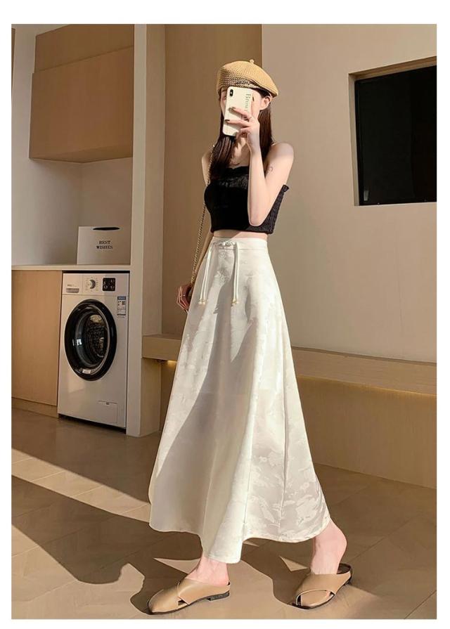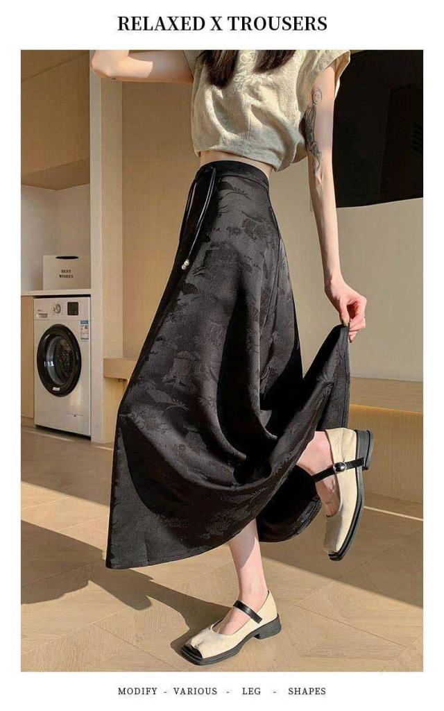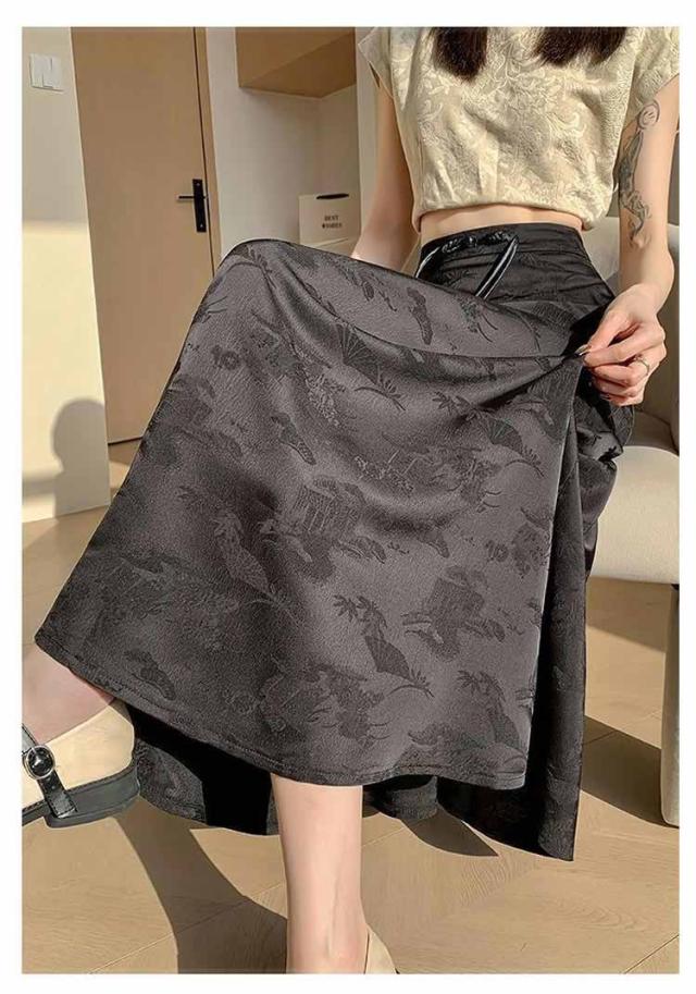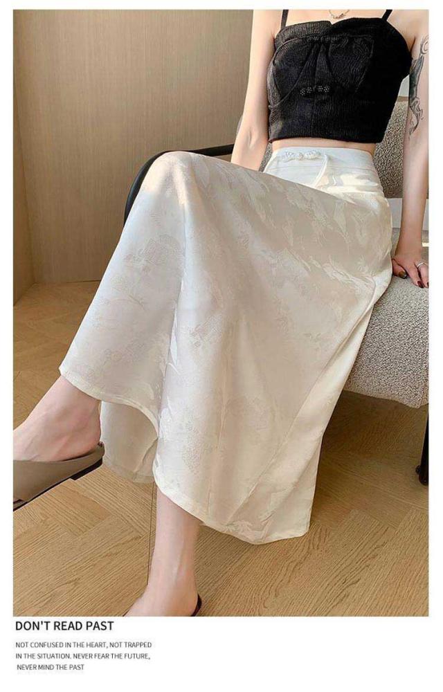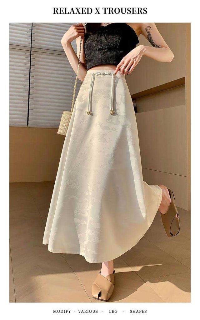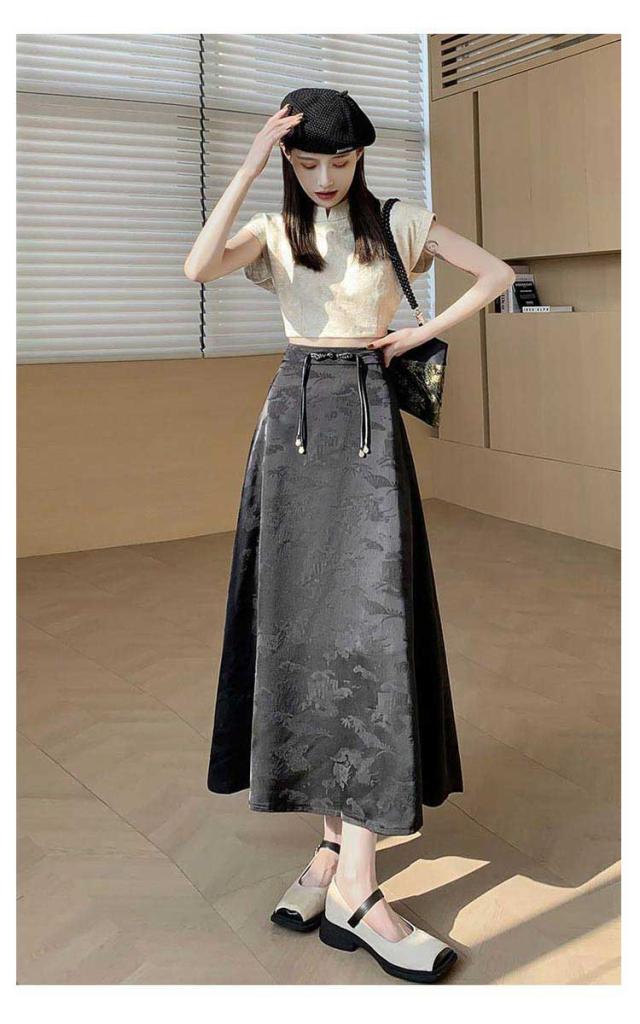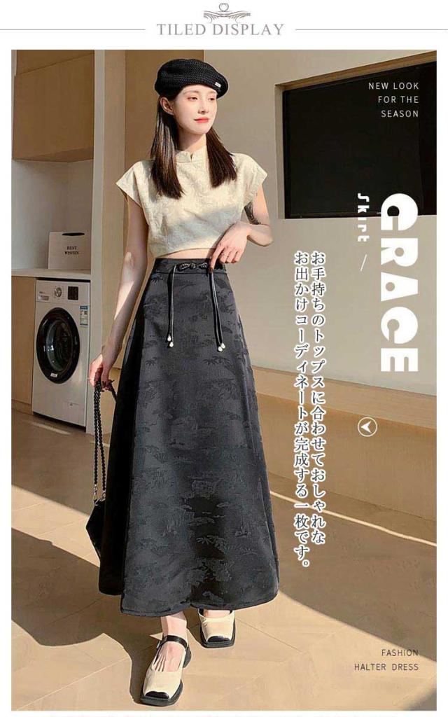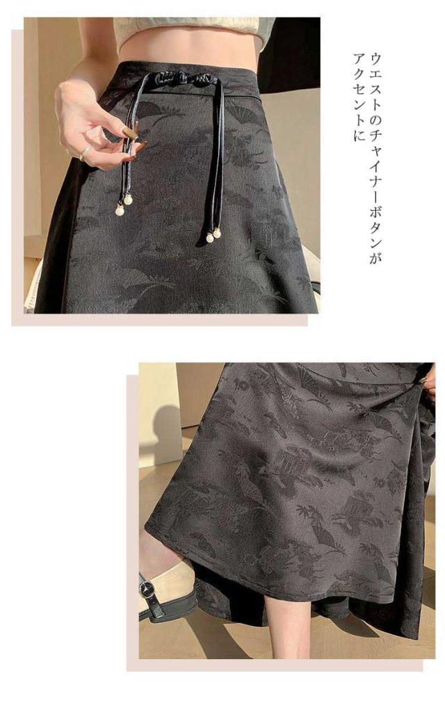 | 一枚穿くだけでエレガントで華やか、ジャガード生地のチャイナ風スカートです。 裾に向かってフレアに広がる、ドレープ感が美しい立体感のあるフェミニンなシルエットもポイント。 ウエストのチャイナーボタンがアクセントに お手持ちのトップスに合わせておしゃれなお出かけコーディネートが完成する一枚です。 | |