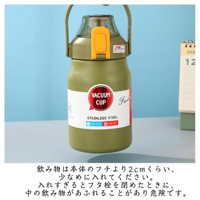 | 注意事項:※飲み物の保温・保冷以外の用途では使用しないでください。 ※中の飲み物が漏れる場合がありますので、本品の横置きはおやめください。 ※飲み物は本体のフチより2cmくらい、少なめに入れてください。入れすぎるとフタ栓を閉めたときに、中の飲み物があふれることがあり危険です。 ※熱湯などを入れる際は、熱いやかんなどが胴部に触れないようにしてください。転倒してヤケドの恐れがあります。 ※熱湯など熱い飲み物を入れて飲む際は、ヤケドの恐れがありますので注意してください。断熱効果により熱い飲み物を入れても胴部外側は熱くなりません。 ※直火・電子レンジ・オーブンなどでは使用しないでください。本品の変形や破損、または加熱器具の故障や火災の原因になることがあります。 ※冷凍庫に入れないでください。本品の破損や変形の恐れがあります。 | |