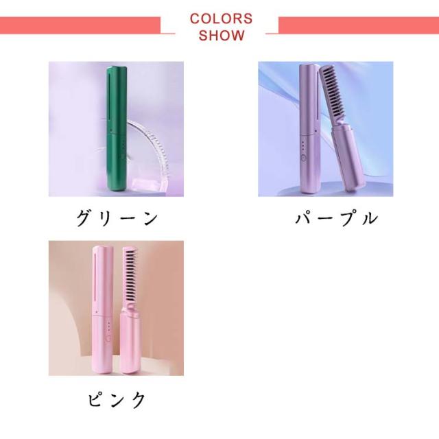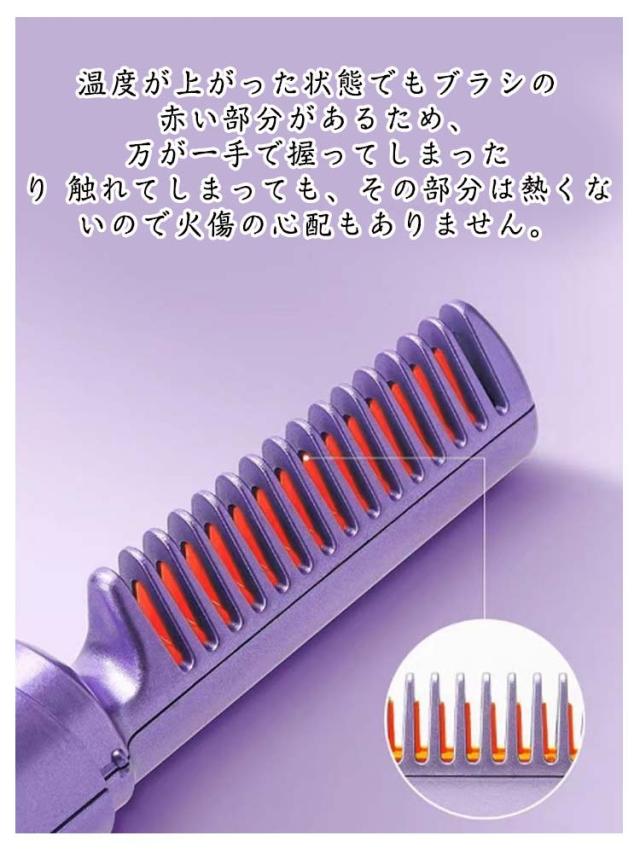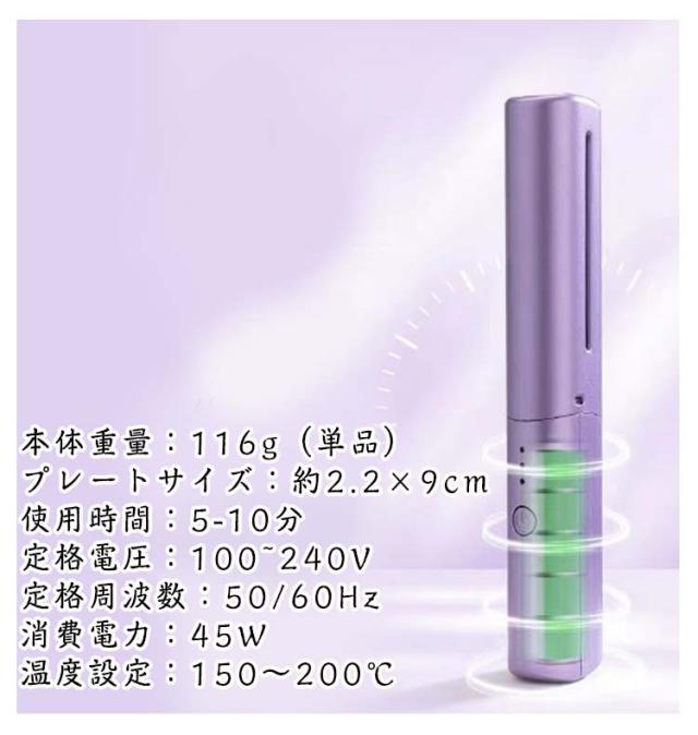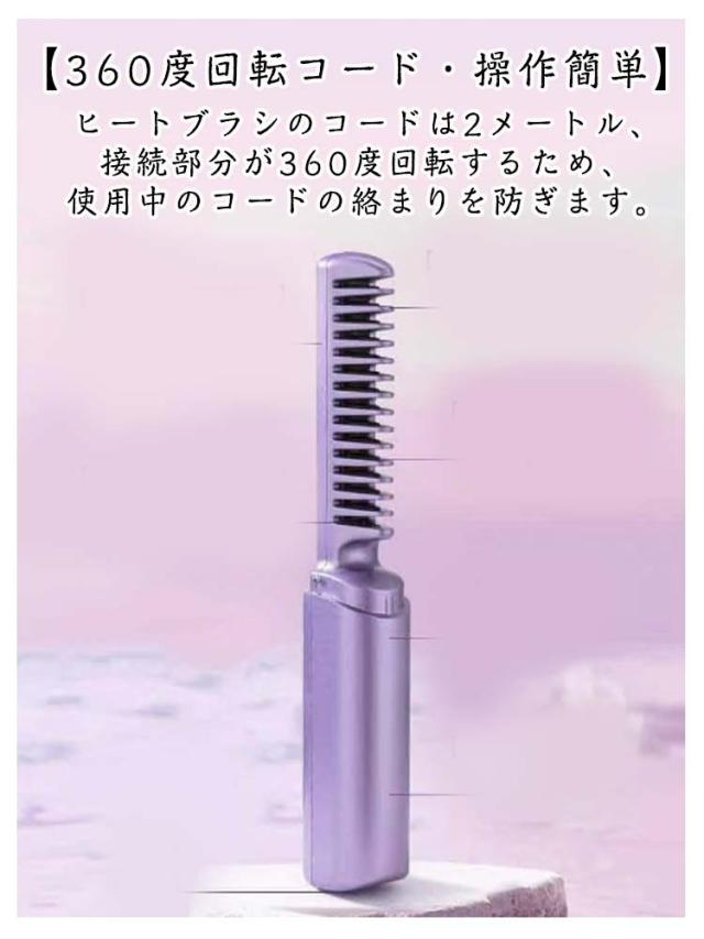 | 【充電式・連続使用】 コードレスストレートアイロンはあらゆる操作にケーブルが邪魔にならず、どこでも使えます。最軽量・コンパクトなデザイン、さらに30〜40分間連続使用可能なので、持ち運びに便利なアイテム!デート/ショッピング/客先訪問すべて楽に対応可能です。 【こだわりの新設計 やけど防止】 安全性アップ。ブラシの外周、ブラシ先端部分に耐熱素材を使用、高温でも地肌を守れます。温度が上がった状態でもブラシの赤い部分があるため、万が一手で握ってしまったり 触れてしまっても、その部分は熱くないので火傷の心配もありません。30分経過すると自動で電源がオフになる安全機能付いています。毛先をキャッチしやすいブラシ設計。絹のように美しく輝く髪を実現する、より繊細な頭皮をダメージから守る。特製ブラシによって頭皮の血行がよくなり、髪に輝き、柔らかさ、そして弾力性を与える効果があります。 【360度回転コード・操作簡単】ヒートブラシのコードは2メートル、接続部分が360度回転するため、使用中のコードの絡まりを防ぎます。前後のスタイリングもらくらく!初心者にも簡単に使えます。 本体重量:116g(単品) プレートサイズ:約2.2×9cm 使用時間:5-10分 定格電圧:100~240V 定格周波数:50/60Hz 消費電力:45W 温度設定:150〜200℃ 電圧100V~240V対応で変圧器なしでも海外もご使用いただけます。 旅行時にスペースを節約できます。旅行や出張にも楽利用できます。 | |