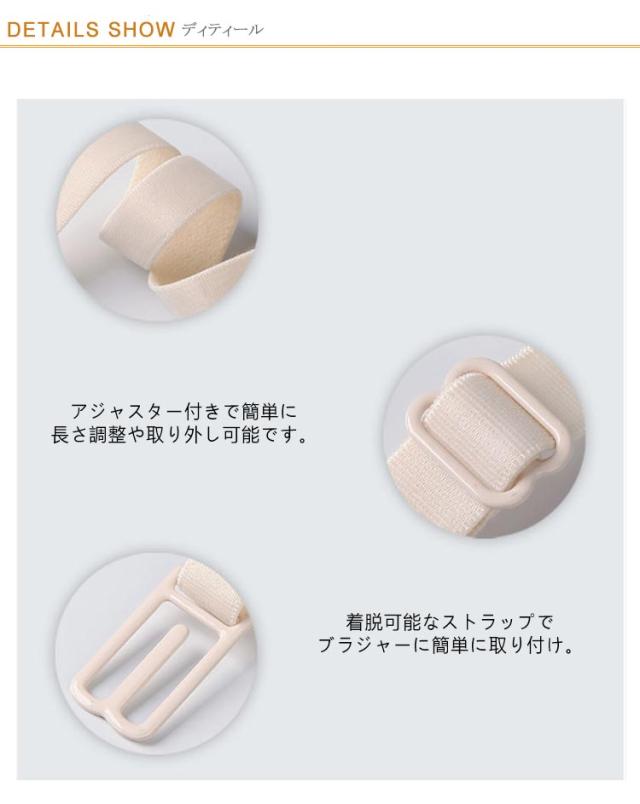 | 付け替えは簡単!肩出しスタイルに目立たないストラップ。 柔らかな素材で快適に着用でき、跡がなく、肌に傷がありません。 伸縮性が優れた、肩ヒモのずれを防ぎバックスタイルを綺麗に見せる。 着脱可能なストラップでブラジャーに簡単に取り付け。 アジャスター付きで簡単に長さ調整や取り外し可能です。 | |