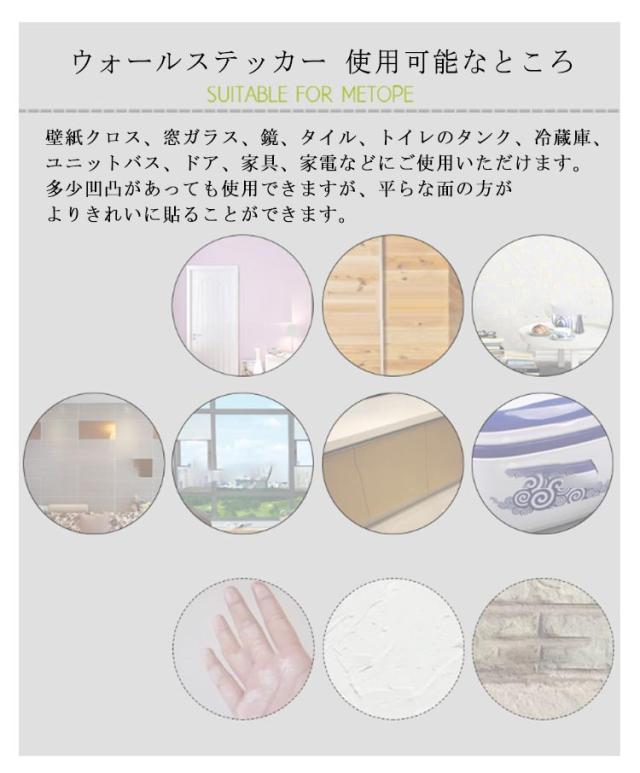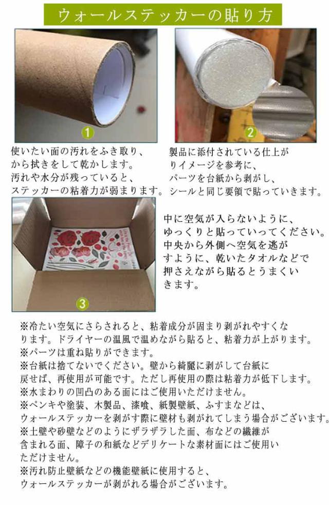 | 貼るだけでお部屋を彩ることができます。 貼りなおしが可能ですので、失敗をしてもやり直しができます。 壁にのりあとを残しにくく、有害物質も含まれておりませんので、賃貸住宅や子供部屋にも安心してご使用いただけます。 ほとんどの製品が両面タイプですので、窓ガラスに使用すると両面からデザインを楽しんでいただけます。 ウォールステッカー 使用可能なところ 壁紙クロス、窓ガラス、鏡、タイル、トイレのタンク、冷蔵庫、ユニットバス、ドア、家具、家電などにご使用いただけます。多少凹凸があっても使用できますが、平らな面の方がよりきれいに貼ることができます。 ウォールステッカーの貼り方 (1)使いたい面の汚れをふき取り、から拭きをして乾かします。汚れや水分が残っていると、ステッカーの粘着力が弱まります。 (2)製品に添付されている仕上がりイメージを参考に、パーツを台紙から剥がし、シールと同じ要領で貼っていきます。 (3)中に空気が入らないように、ゆっくりと貼っていってください。中央から外側へ空気を逃がすように、乾いたタオルなどで押さえながら貼るとうまくいきます。 ※冷たい空気にさらされると、粘着成分が固まり剥がれやすくなります。ドライヤーの温風で温めながら貼ると、粘着力が上がります。 ※パーツは重ね貼りができます。 ※台紙は捨てないでください。壁から綺麗に剥がして台紙に戻せば、再使用が可能です。ただし再使用の際は粘着力が低下します。 ※水まわりの凹凸のある面にはご使用いただけません。 ※ペンキや塗装、木製品、漆喰、紙製壁紙、ふすまなどは、ウォールステッカーを剥がす際に壁材も剥がれてしまう場合がございます。 ※土壁や砂壁などのようにザラザラした面、布などの繊維が含まれる面、障子の和紙などデリケートな素材面にはご使用いただけません。 ※汚れ防止壁紙などの機能壁紙に使用すると、ウォールステッカーが剥がれる場合がございます。 | |