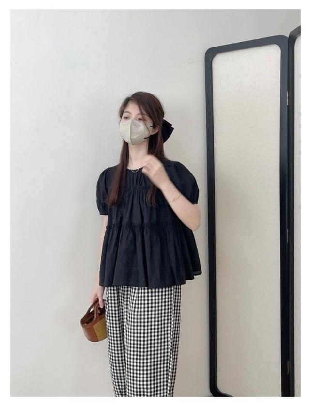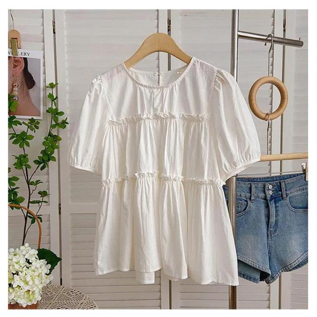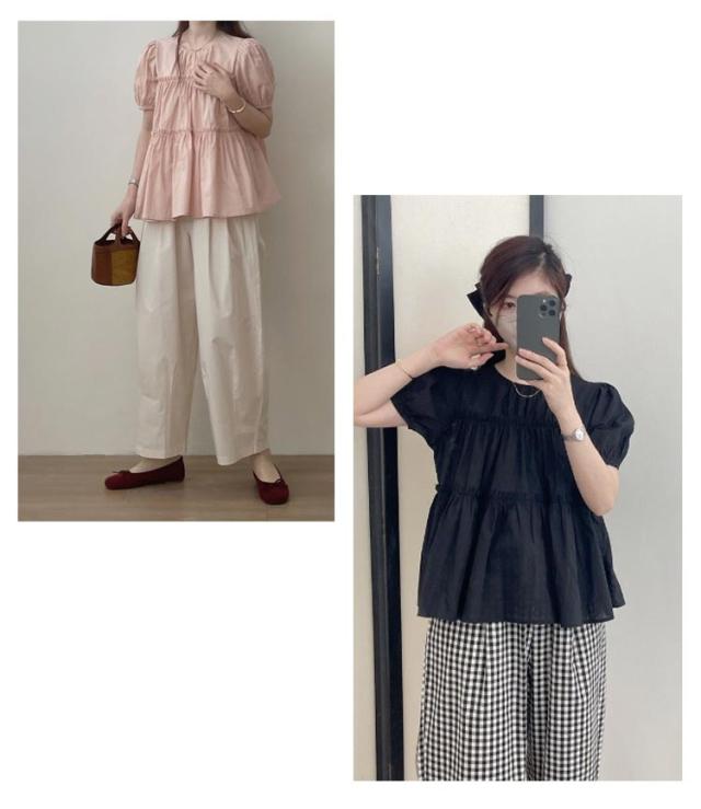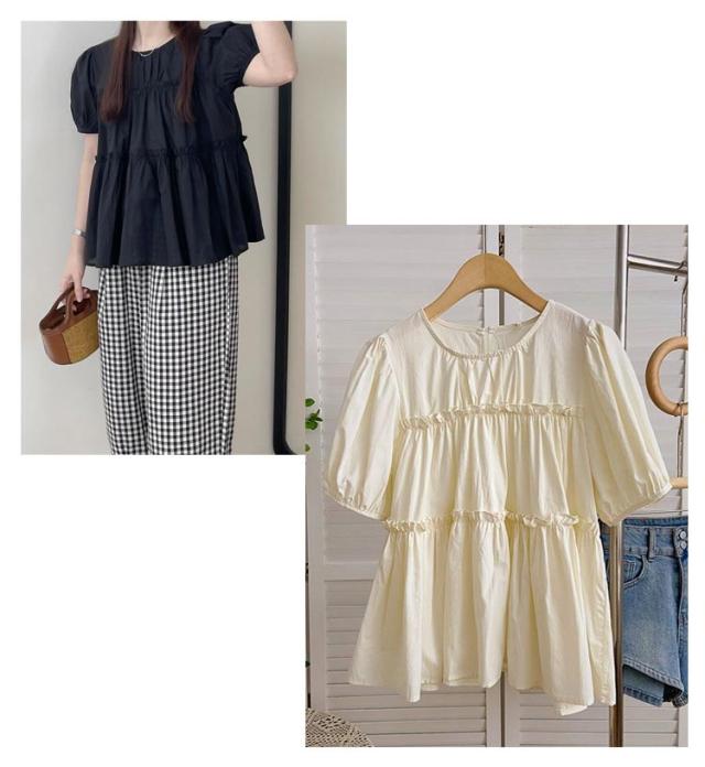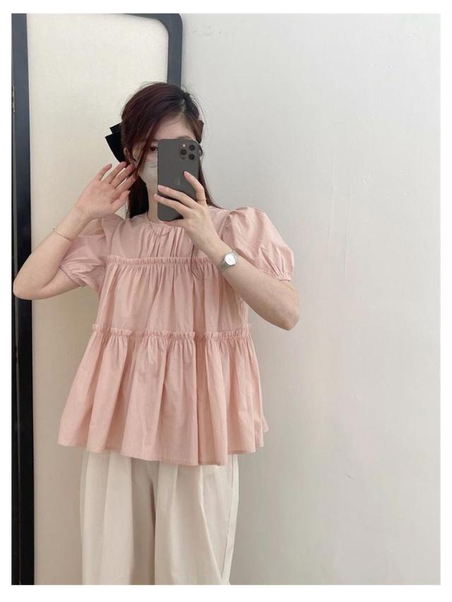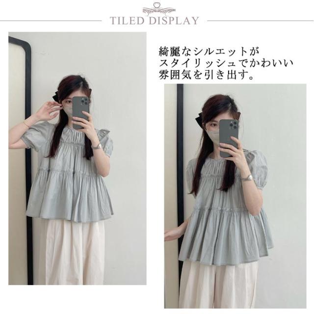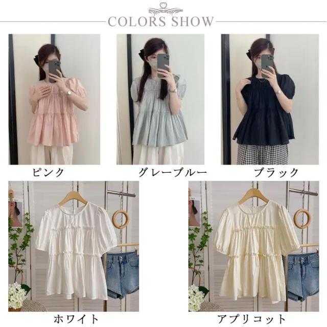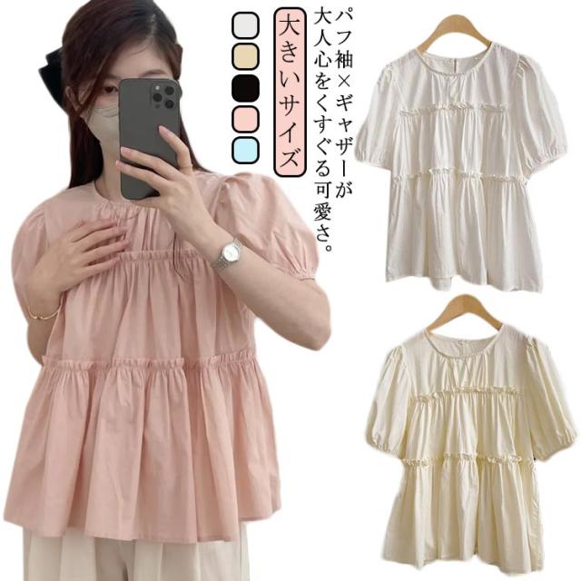 チュニック プルオーバー パフスリーブ ギャザー ブラウス レディース トップス ペプラム シャツ ティアードブラウス ブラウス 半袖 ゆったり 体型カバー マタニティ シャツ 大きいサイズ ボリューム袖 大人可愛い 夏服 無地