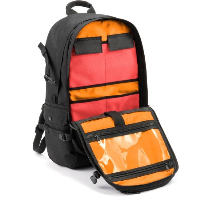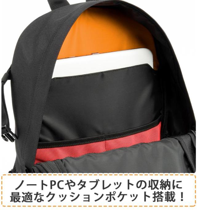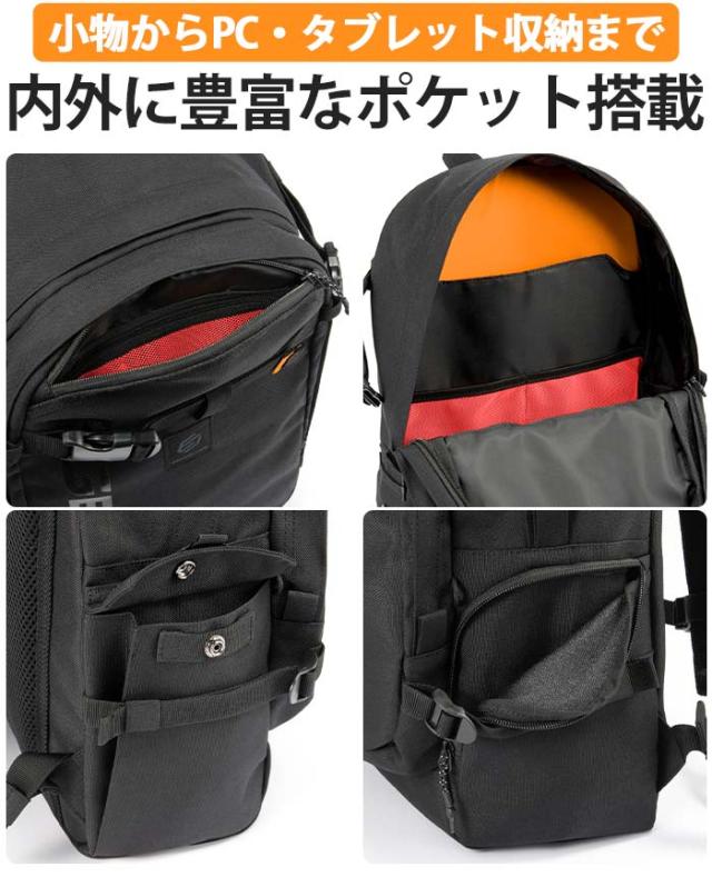 ノートPCやタブレットの収納に最適なクッションポケットを搭載。内外に小物類の収納に便利なポケットが充実で使いやすさ抜群!スケボーや自転車での通学、通勤に最適なチェストベルト付き。