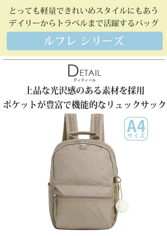 | この商品について | 自分らしさを大事にする、ナチュラルな女性のためのMyクローゼットブランド≪Kanana project Collection/カナナプロジェクトコレクション≫。 上品な光沢感のある素材を採用し、とっても軽量できれいめスタイルにも合わせやすいトータルトラベルシリーズ『ルフレ』登場! A4サイズ対応で普段使いから通勤やレジャーなどにも使いやすいサイズ感。小物収納に便利なポケットも充実。ペットボトルなどを収納するのに便利なボトルホルダーもついています。 ショルダーベルトは女性が背負うのにちょうどいいスッキリとしたシルエット。ほどよい光沢感のあるエナメルの部分使いもおしゃれ♪ 旅のお守りとして可愛いホワイトのチャーム付きなのも女性心をくすぐります。 大人カジュアルなコーデに合わせやすいシンプルデザインと機能性を両立した、デイリー使いからトラベルまで幅広いシーンで活躍するリュックサックです。 |