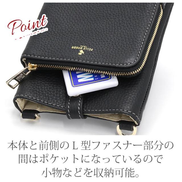 前面のL字ポケットには折り財布がスッキリと収まり、日常使いに便利。厚みのあるアイテムも収納可能で、使い勝手の良さを追求しています。
