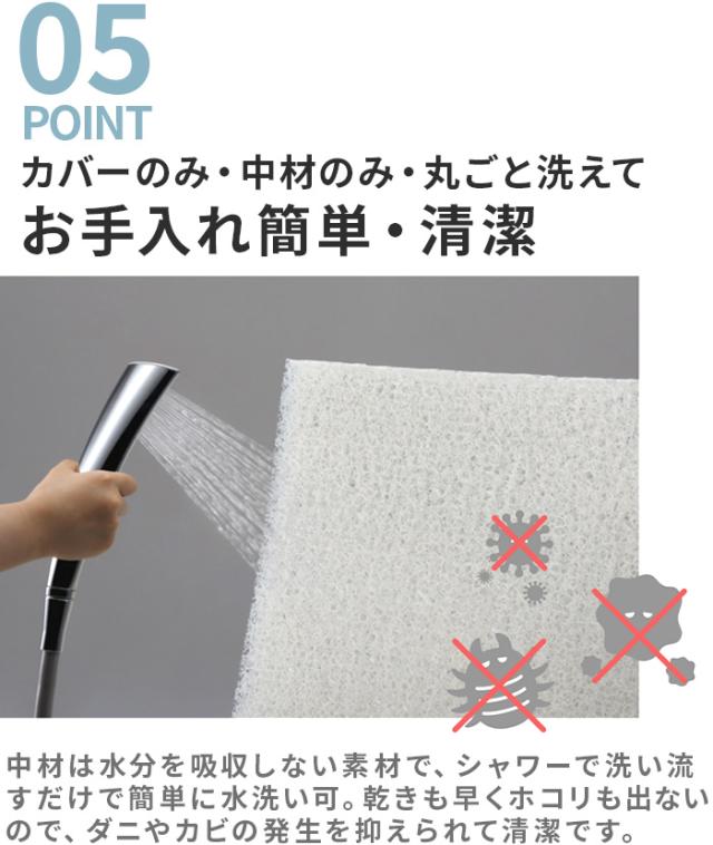 | お洗濯はカバーを付けたまま、カバーのみ、中材のみの3通りで手洗い可能です。 洗濯機を使用する場合は、洗濯ネットに入れて手洗いモードなど非常に弱い洗濯処理をしてください。(中性洗剤または無蛍光洗剤を使って単独でお洗いして頂くようお願いします。) |