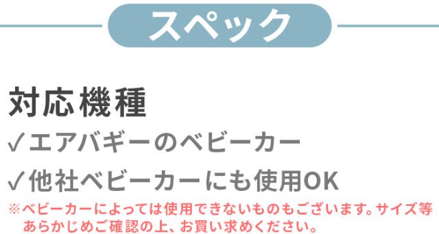 | ●エアバギー製品のベビーカー ●他社ベビーカーOK ※ベビーカーによっては取り付けできないものもございます。サイズ等あらかじめご確認の上、お買い求めください。 |