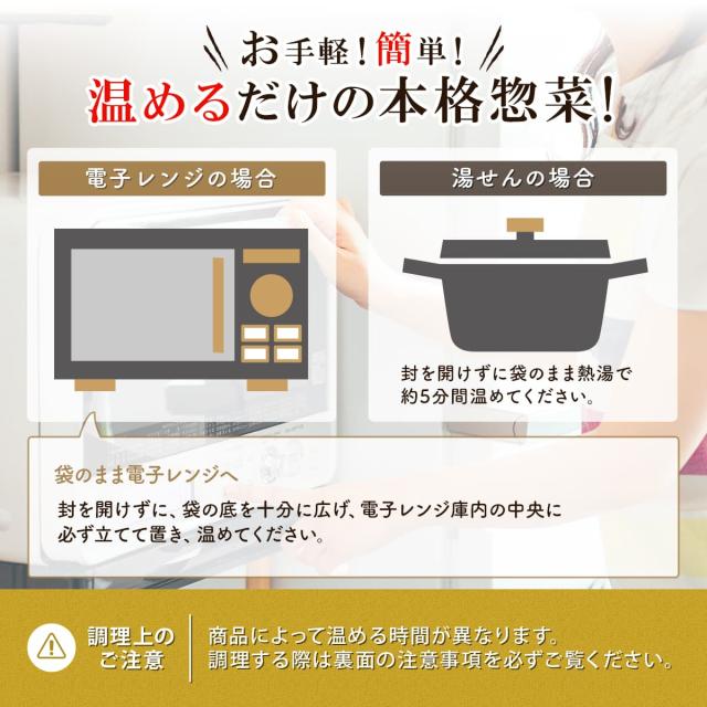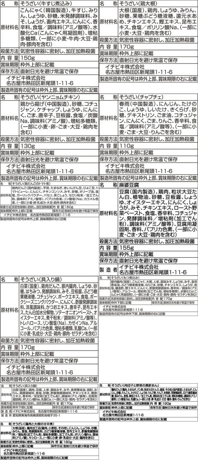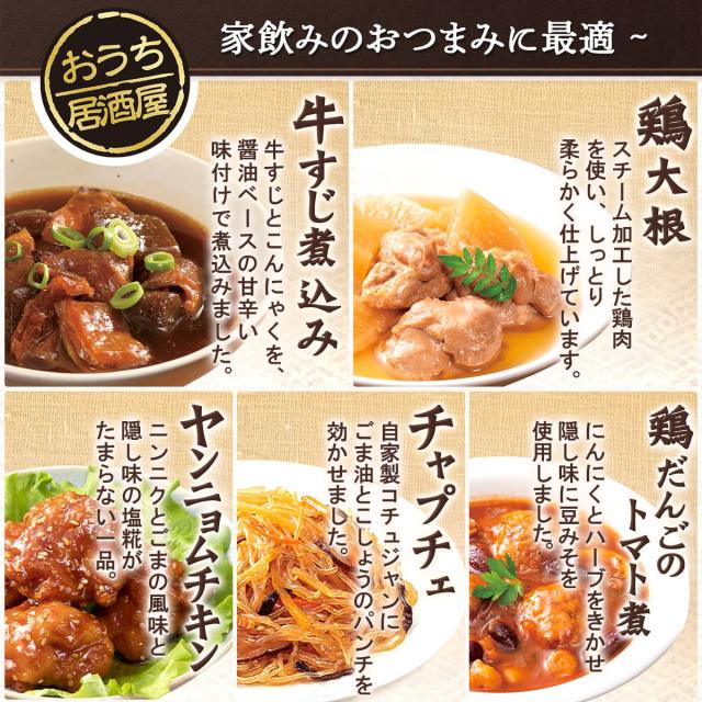 ■ おうち居酒屋 牛すじ煮込み 150g 鶏大根 170g ヤンニョムチキン 130g チャプチェ 110g 鶏だんごのトマト煮 160g ■ 赤から 赤から麻婆豆腐 155g 赤から一人前鍋 170g ■ Onepaku 肉団子と野菜の黒酢あん 190g 鶏肉と大根の甘辛煮 180g ■ とり野菜みそ とり野菜みそもつ煮込み 170g とり野菜みそ一人前鍋 170g 11種の中から10食お選びください |