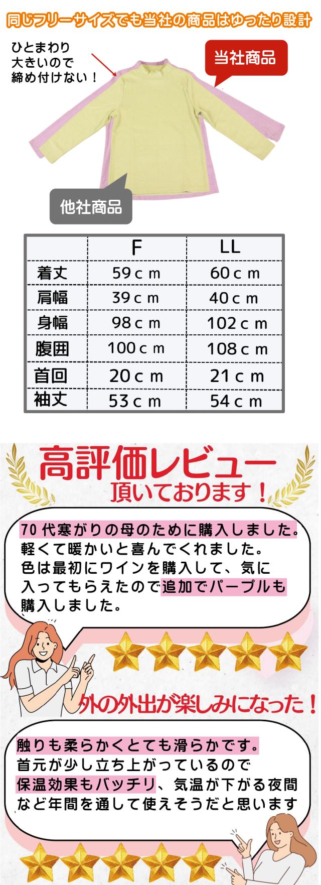 ■カラー 02ローズ01うすピンク01きみどり01ラベンダー01チェリー1.ワイン2.パープル3.チャコール4.ブラック■シーズン 秋冬■テイスト(ファッション) カジュアルエレガントインナーTシャツ■サイズ(フリーサイズ/ LLサイズ) フリーサイズ(平に置いた状態で製品を測りました。)着丈:59CM肩幅:39CM(通常時)身幅:98CM(通常時)腹囲:100CM(通常時)首回:20CM(通常時):29CM(伸ばした状態)袖丈::53CMLLサイズ(平に置いた状態で製品を測りました。)着丈:60CM肩幅:40CM(通常時)身幅:102CM(通常時)腹囲:108CM(通常時)首回:21CM(通常時):30CM(伸ばした状態)袖丈::54CM長さ(袖) 長袖(53CM-54CM)■裏地(有/無) 裏地なし■スタイル(ネック) ハイネック■洗濯表示 家庭洗濯■機能性(生地・布) スーパーストレッチノンストレスでつっぱり感がありません。締め付け過ぎず、ゆる過ぎない。■柄 無地■素材(生地・毛糸) 素材:東レ インターアクション(発熱・蓄熱)日本製アクリル:62%レーヨン:32%ナイロン:4%ポリウレタン:2%■生産国 純国産素材:日本縫製:日本■特徴 東レのインターアクションは、東レのマイクロアクリルとレーヨンを組み合わせた暖か素材です。生地を編み立てて染色した後、起毛加工や独自の技術で毛先を整えることで、空気層を多く含み、保温性と風合いの良さを実現しています。?やわらかな肌触りしっとり、ふっくらとした素材感ストレッチ素材で動きやすいマイクロアクリルの極上の肌触りレーヨンの光沢感?秋冬にぴったりの素材で、1枚でもインナーとしても幅広く使用できますしっかり肉厚であたたかい無地でシンプルデザインだから着回しが効くカットソー。手を通した瞬間からあたたかい瞬暖発熱素材が優しく柔らかく包み込みます。【1003782】ゆったりサイズ感。体系が外側に出過ぎないのでシルエットが美しく体系カバーになります。やわらかく、あたたかいので、重ね着せず肩こりや着ぶくれの解消につながります。■注意事項 ※繊維製品のため、同じ商品であっても±1〜2cmの差が生じる場合がございます。※商品の撮影には最大限注意を払っておりますが、閲覧時のモニター環境によりましては実際の商品と若干違うお色味に映ることもございます。