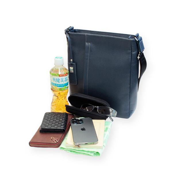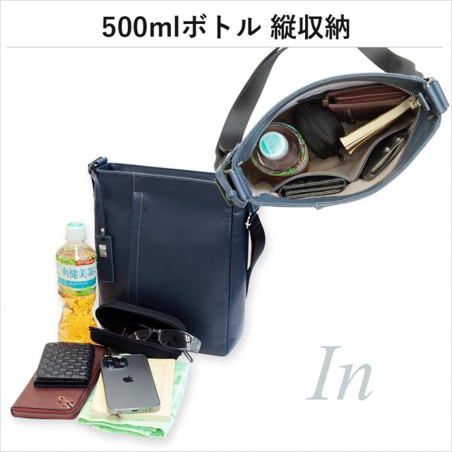500mlペットボトルが縦に収まり、長財布、メガネケース、タブレットやガイドブック等の必要アイテムをすっきりスマートに収納できる、頼れる収納力と共にスマートなフォルムを実現したショルダーバッグです。