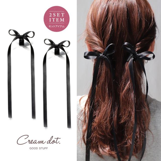 サテン調生地の2セットロングリボンクリップ。ミニマムだけどロングフォルムの絶妙なボリューム感が抜群に可愛い◎可愛くなり過ぎないブラックリボンで大人フェミニンを楽しんで。