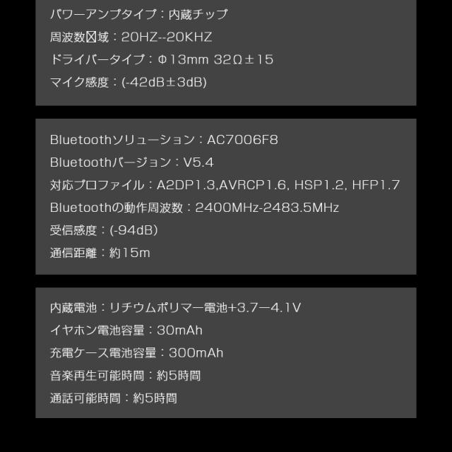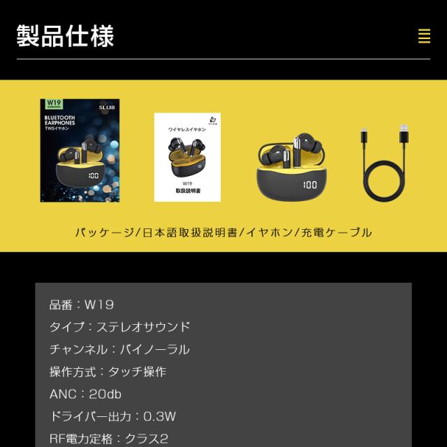 【パッケージ内容】イヤホン本体、充電ケーブル、イヤピースセット、日本語取扱説明書。