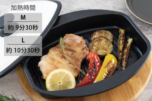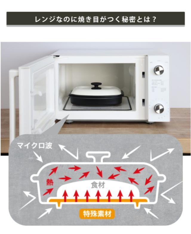 電子レンジのマイクロ波を直接食材に当てず、底面の特殊素材に当てる事で本体底面を発熱させ、まるでフライパンで焼いたような焼き目をつけることができます。
