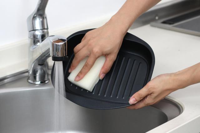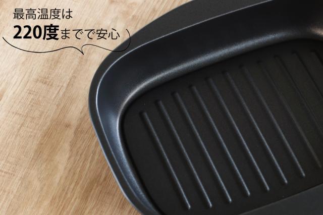表面にはふっ素樹脂塗膜加工が施されているのでお手入れが簡単です。また、加熱時には220度までしか温度が上がらないので、表面の塗膜が劣化したり、有害なガスが発生することがなく安心です。