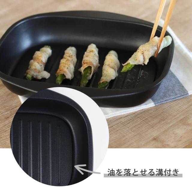 フチに付いている溝に食材から出た油が落ち、ヘルシーに調理できます。