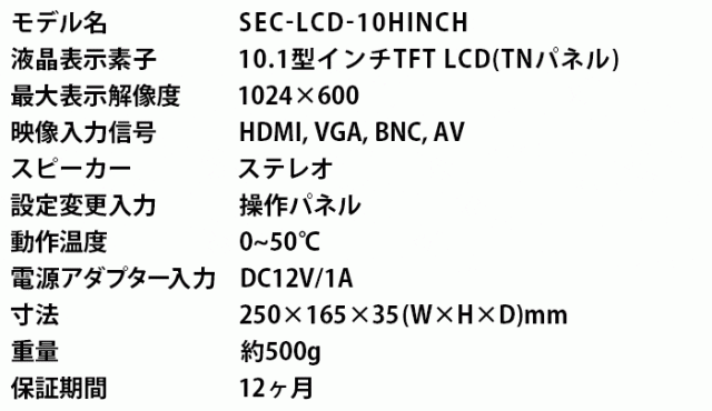 SEC-LCD-10HINCH(TN) | 10.1インチHDMI・VGA・BNC・RCA入力搭載TFT液晶モニター