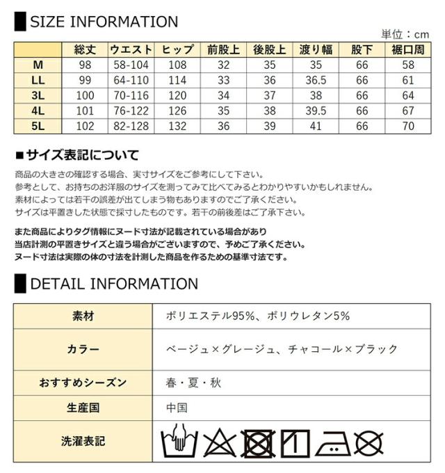 5L:総丈102 ウエスト82-128 ヒップ132 前股上36 後股上39 渡り幅41 股下66 裾口周70