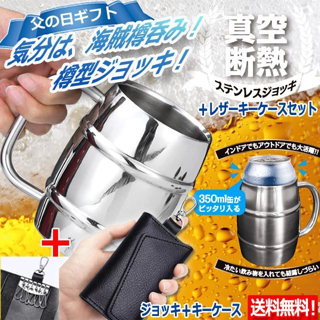 父の日ギフト (真空断熱 ステンレス樽型ジョッキ 1点 350ml缶ジャストフィット & レザーキーケースセット) ビール ジュース 冷却 アウトドア キャンプ 温冷