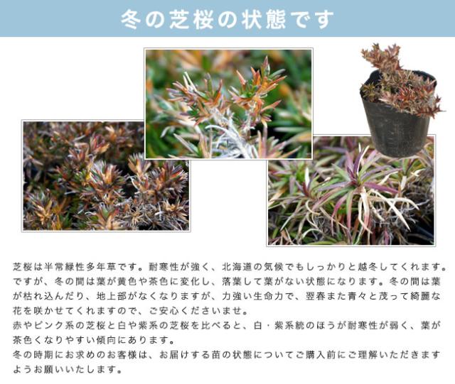 芝桜(しばざくら)は暑さ、寒さ、乾燥に強く、地面を這うように生長します。3月下旬〜5月には、地面を覆い隠すように花が咲きます。花色も多数の品種があり、 グランドカバー(1平米あたり25株植えます)や他の植物と合わせて寄せ植えにするなど、用途も様々でいろいろな場面で幅広く活用いただけます。