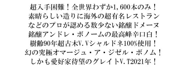 超入手困難!全世界わずか1,600本のみ! 素晴らしい造りに海外の超有名レストラン などのプロが認める数少ない銘醸ドメーヌ 銘醸アンドレ・ボノームの最高峰辛口白! 樹齢90年超古木V.Vシャルドネ100%使用! 幻の究極オマージュ・ア・ジゼル・ボノム! しかも愛好家待望のグレイトV.T2021年!
