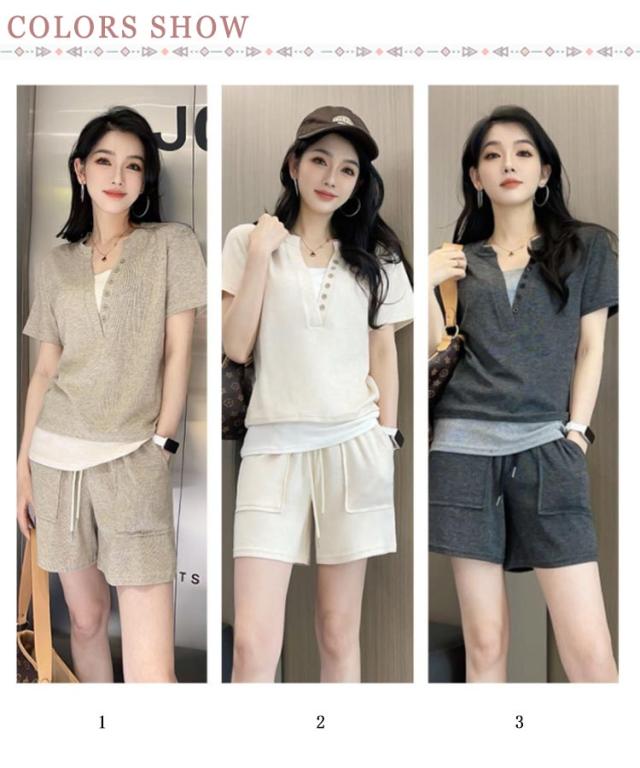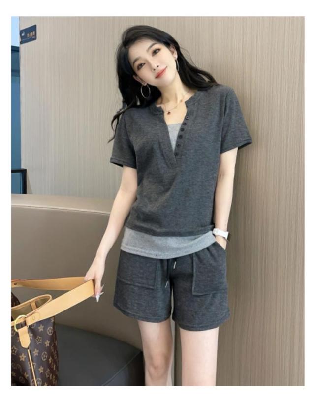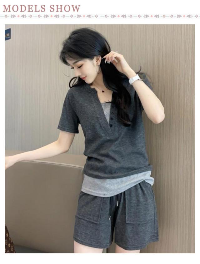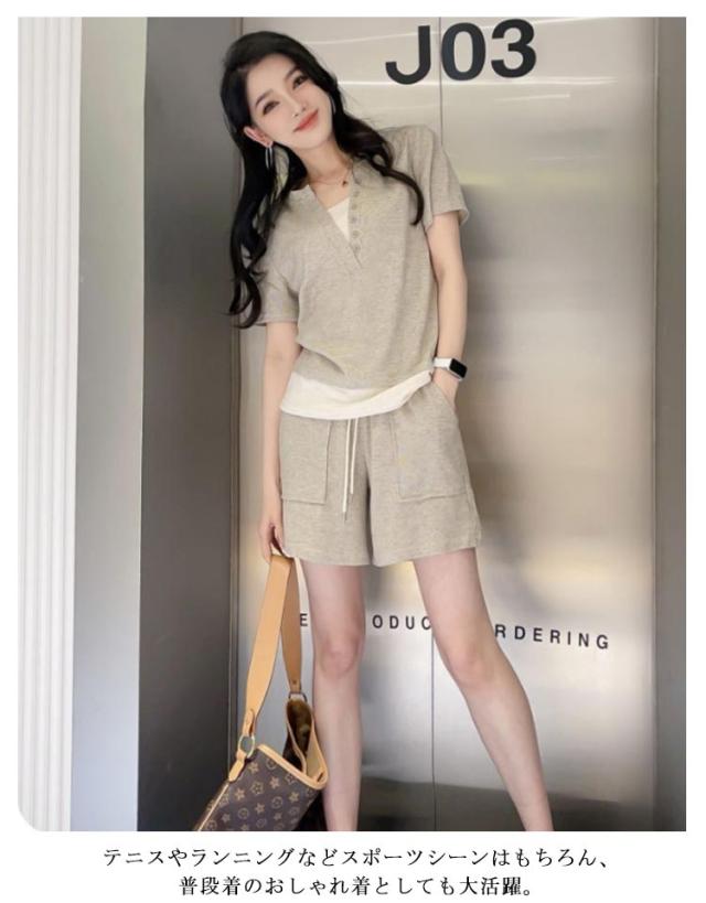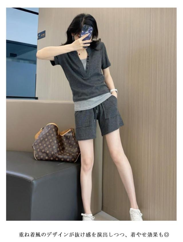 ショートパンツ レディース 半袖Tシャツ ランニング 夏 スポーツウェア 上下セット 重ね着風 フェイクレイヤード 短パン カットソー ヘンリーネック 送料無料 送料無料 ルームウェア 部屋着 普段着