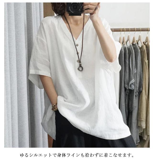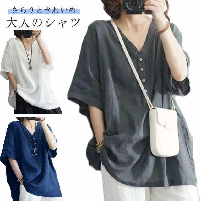 ホワイトシャツ 半袖 白シャツ トップス シャツブラウス 7分袖 着痩せ ゆったり 大人 tシャツ 春 チュニック レディース ブラウス シャツ 抜け感 ドルマンスリーブ リネン風 無地 vネック 大きいサイズ シンプル 夏 30代 40代