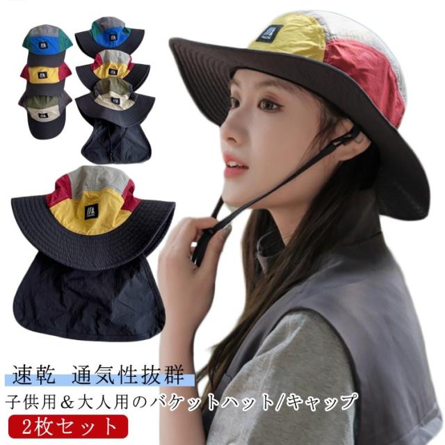 キッズ 親子 夏 たれ付き ハット 帽子 キャップ あご紐付き 防風 首筋ガード つば広 大人 取り外し可能 折り畳み ネック 2枚セット 紫外線対策 ゴム付き サイズ調整 首筋カバー サンハット 日よけ UV 2枚セット UVカット