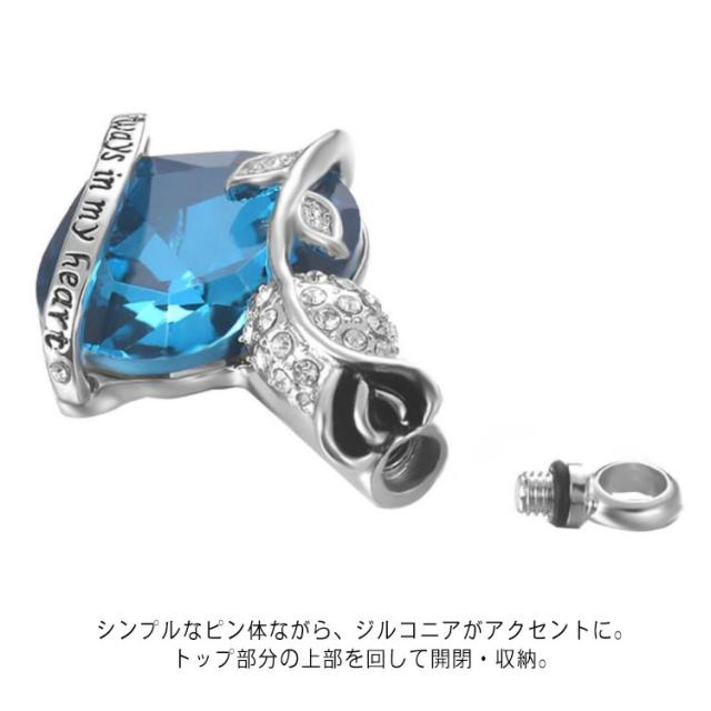 | ハートラインストーンデザイン、故人やペットの遺骨・遺毛・爪などを収めるためのメモリアルペンダント。 大切な方やペットの形見をいつも胸元に、お守り代わりとして身につけることもできます。 シンプルなピン体ながら、ジルコニアがアクセントに。トップ部分の上部を回して開閉・収納。 香水なども入れることができます。 | |