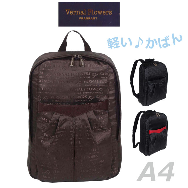 リュック レディース 50代 Vernal Flowers リュックサック A4サイズ vf-023 レディースリュック 軽量 旅行 バッグ きれいめ 通勤 通勤リュック おしゃれ 女性 大容量 軽い 60代 70代 大人 シンプル デイパック 通勤バッグ 旅行リュック a4対応 黒 ブラック 茶 ブラウン 赤