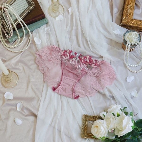 フロント上辺にあしらったインケミレースは、裏地のカラーを分けることで、着用した際に刺しゅうが肌に浮かび上がり、ヌーディー感とクラシカルな上品さを演出。サイドには存在感のあるバラのアップリケを添えて、華やかさを引き立てます。リボン中央には小花のアップリケをあしらい、可愛らしさをプラスしました。