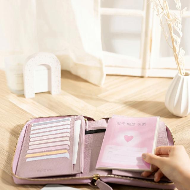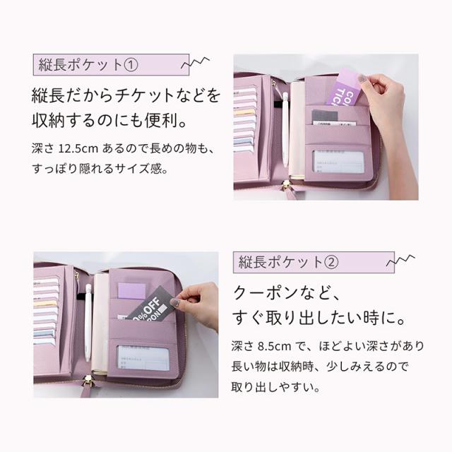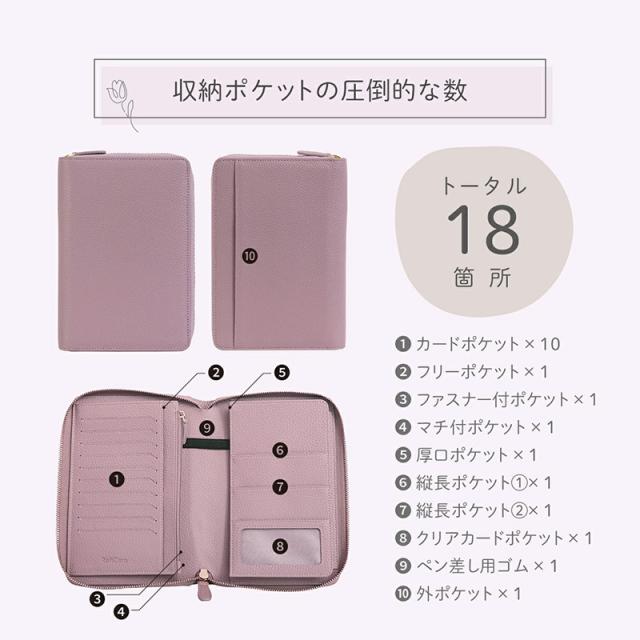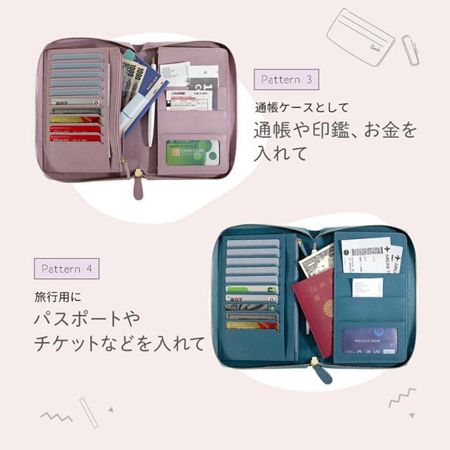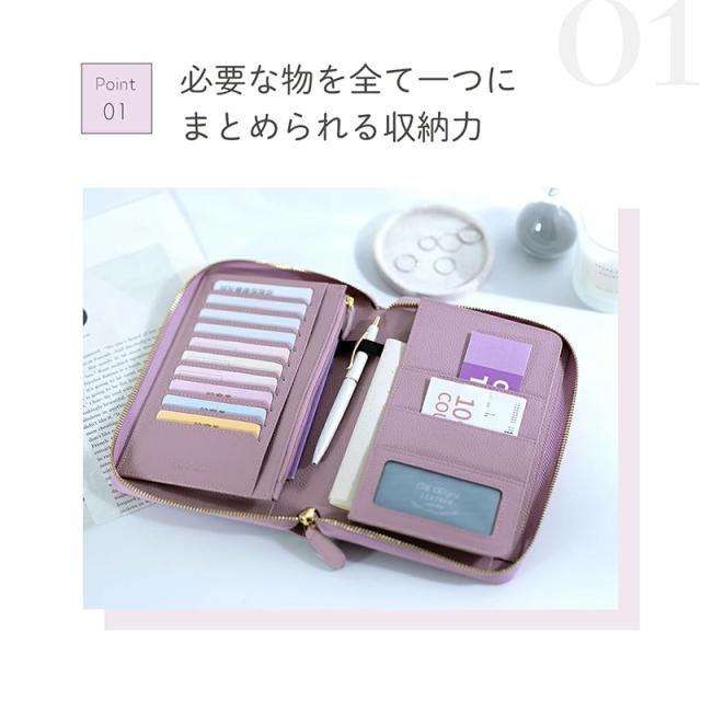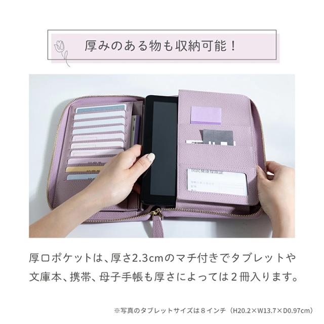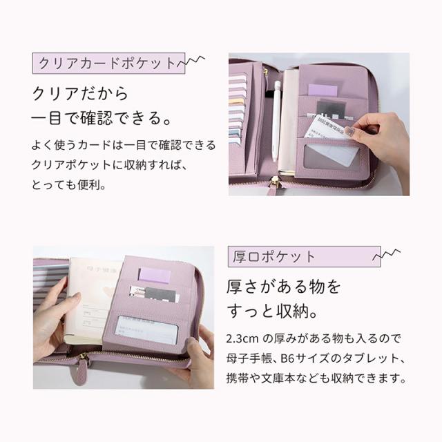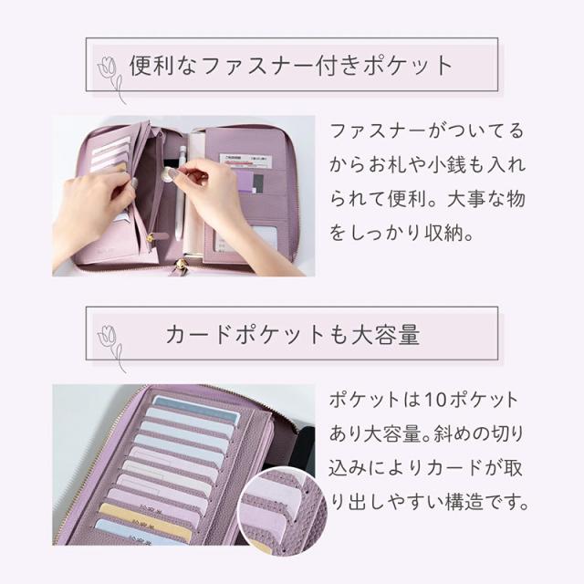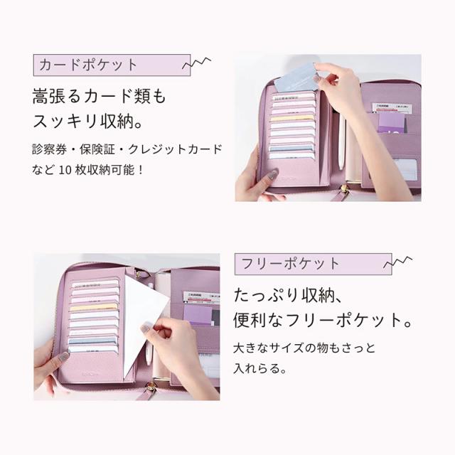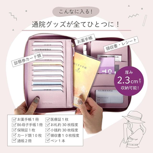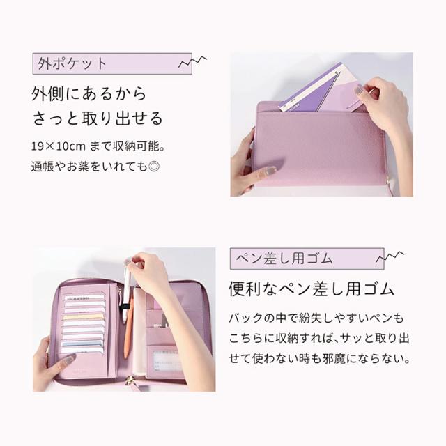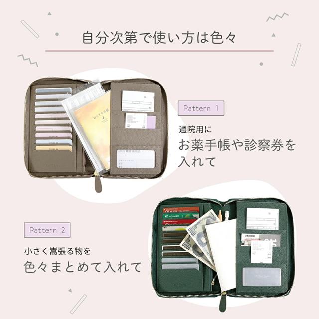 ブックタイプの見開き収納で、お薬手帳・保険証・医療証などの通院グッズをすっきり整理整頓。カードポケットはたっぷり10枚分。お金や大切なものの収納に安心なファスナー付きポケット。マチ付きフリーポケットには分厚くなりがちな手帳もしっかり収まります。通帳や印鑑を入れて銀行用に、パスポートやチケットを入れて旅行用に、マルチに使えるケースです。