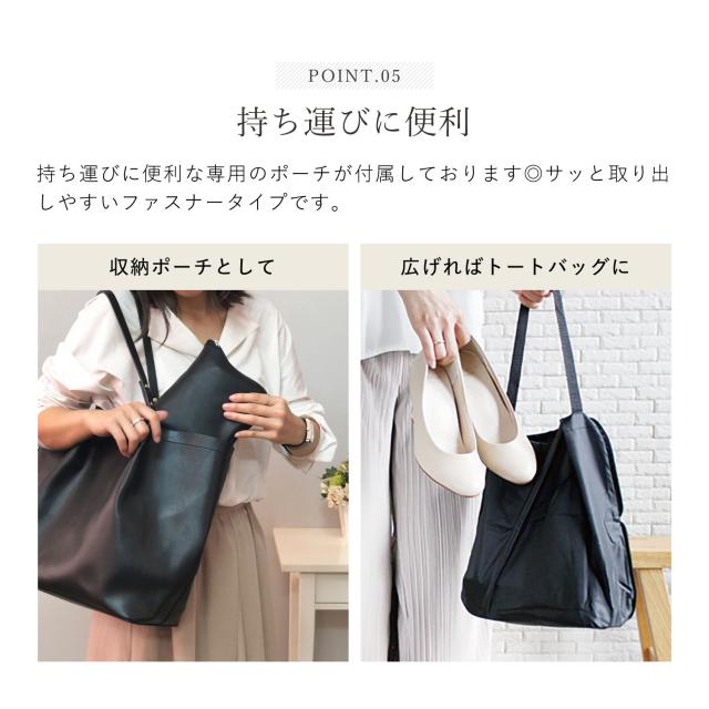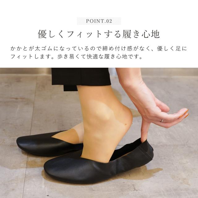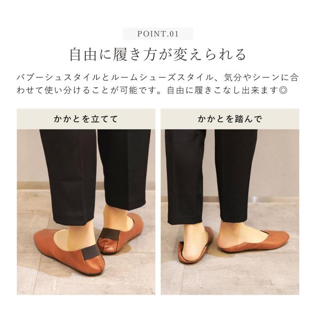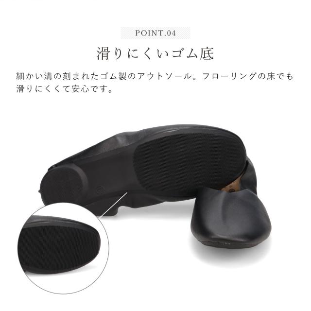 Vカットとスクエアトゥは、美脚効果で上品な印象です。柔らかい合皮とかかとの太ゴムで締め付け感なく優しく足にフィット。カジュアルでもフォーマルでもマッチするデザインで、5mmヒール高で歩きやすく、履いてきた靴を収納できるトートにもなる収納ポーチが付きます。学校行事用スリッパ、オフィスの替え靴、習い事用スリッパ、冠婚葬祭の替え靴として大活躍。大人の女性の為の華やぐスリッポン。