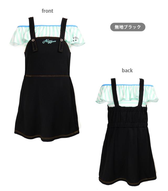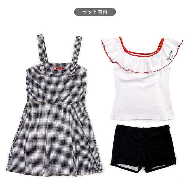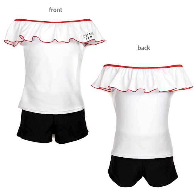 ALGY セパレート水着3点セットアップ キッズ ジュニア 140 150 160 無地ブラック チェックブラック 33150367 アルジー タンキニ水着 ワンピース 子ども 子供 女の子 女児 女子 オフショルダー ショートパンツ 短パン フリル 緑 赤 白 グリーン レッド ホワイト sw3553