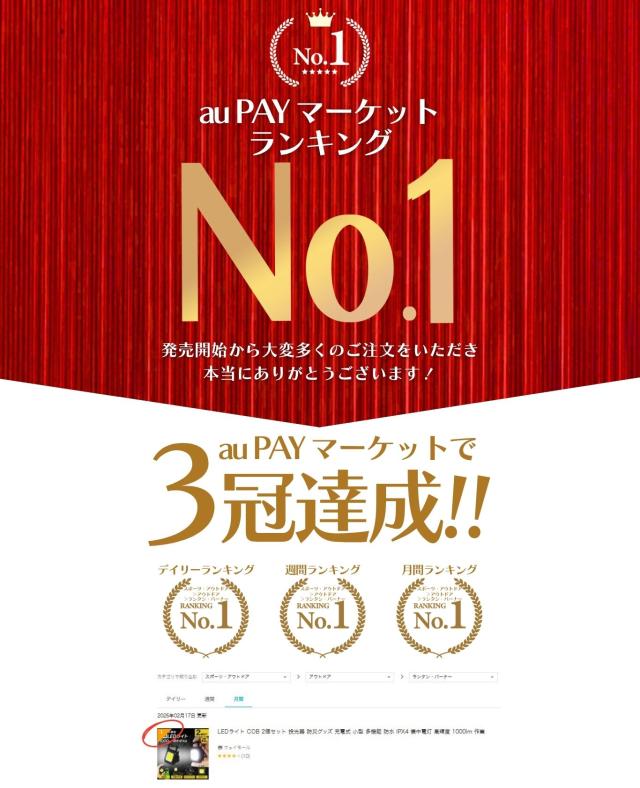 | 特徴 | LEDチップ:COBチップ×1 防水レベル:IPX4(生活防水) 充電方式:USB Type-C カラビナ・スタンド・マグネット付き 充電時点灯可能 |