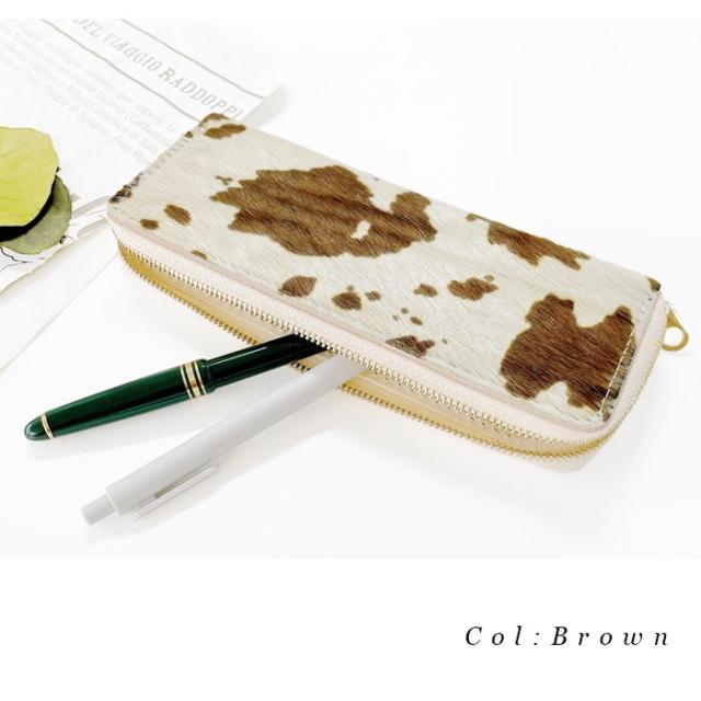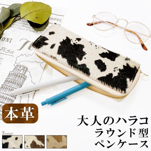 ラウンド型 ペンケース 筆箱 ふで箱 大人の ハラコ 牛柄 レディース 本革 大容量 収納 レザー ペン入れ スリム 筆記用具 デスク おしゃれ かわいい