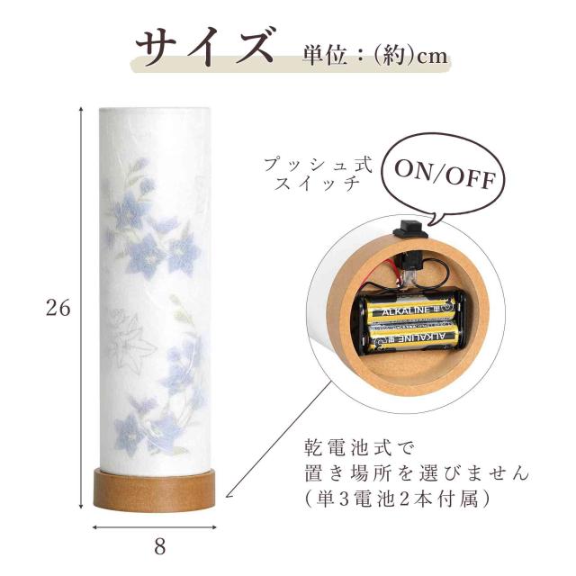 LED灯のあたたかな灯明、「二重張り」と呼ばれる独特な構造は、ふわりと優しく絵柄が投影される逸品。プッシュスイッチ式のコードレス、アルカリ単三電池2本を使用します。台座は木製の落ち着いた質感。コンパクト・小型の盆提灯でも、伝統的な趣きを大切にした本格的な製品をお探しの方に、お勧めです。